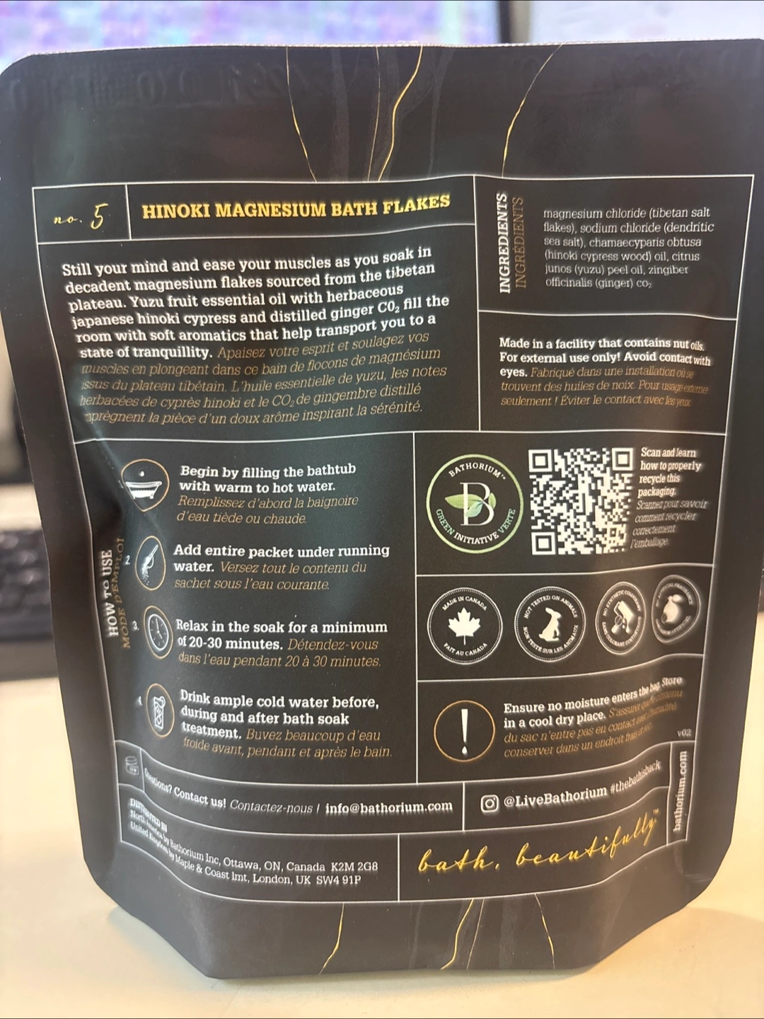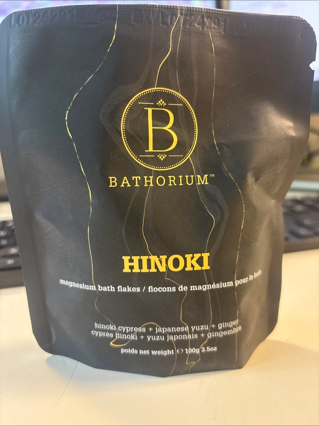 Enjoy a relaxing soak with Bathorium Hinoki Magnesium Bath Flakes! These flakes are perfect for easing muscles and creating a tranquil atmosphere with their blend of hinoki cypress, Japanese yuzu, and ginger. Net weight is 100g (3.5oz).