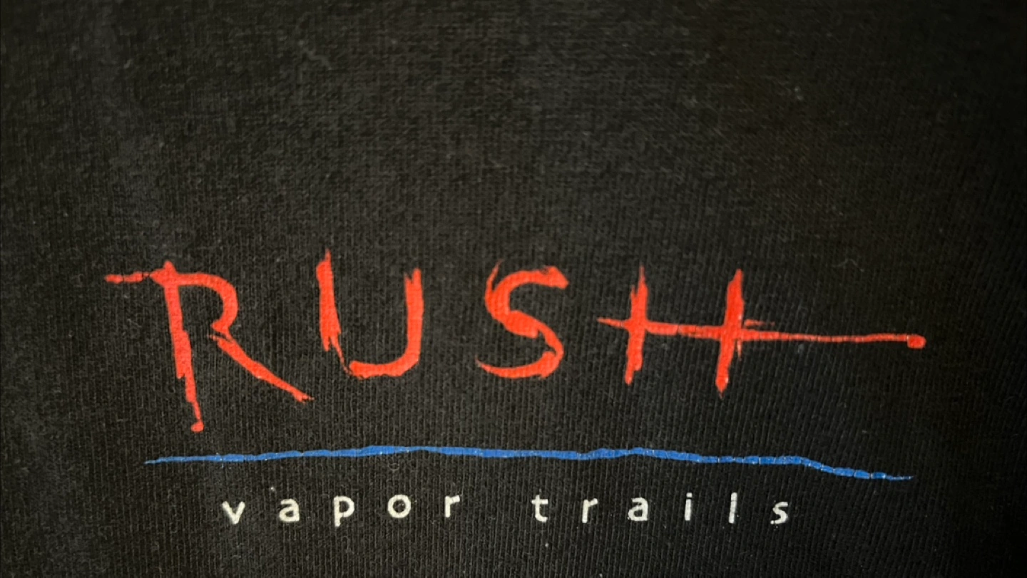 A must-have for any Rush fan, a new and never worn black official t-shirt from the band’s 2002 Vapor Trails tour awaits you.