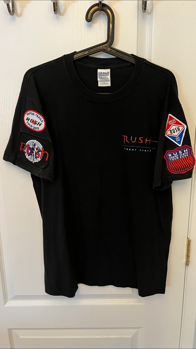 This medium sized 100% cotton Made in Canada shirt (just like the band) features patches not found on any other Rush concert shirt dating back to 1974. No curling, colour fading, stains, rips, nothing. In one of my closets all this time.