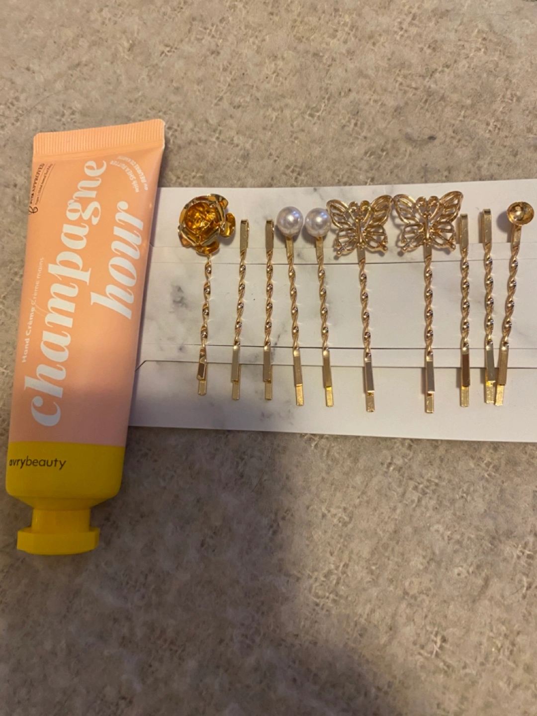 Selling a set that includes AvryBeauty Champagne Hour hand creme and a set of gold-toned hair pins! The hair pins feature various designs like roses, pearls, and butterflies. Perfect for adding a touch of glam to your everyday look