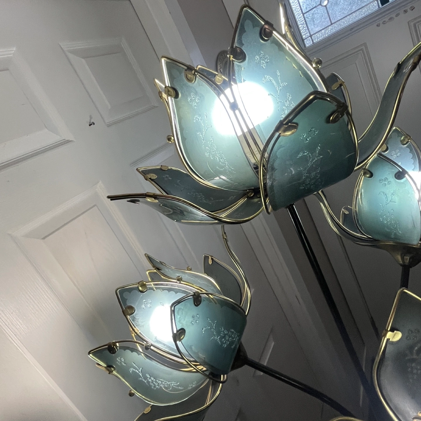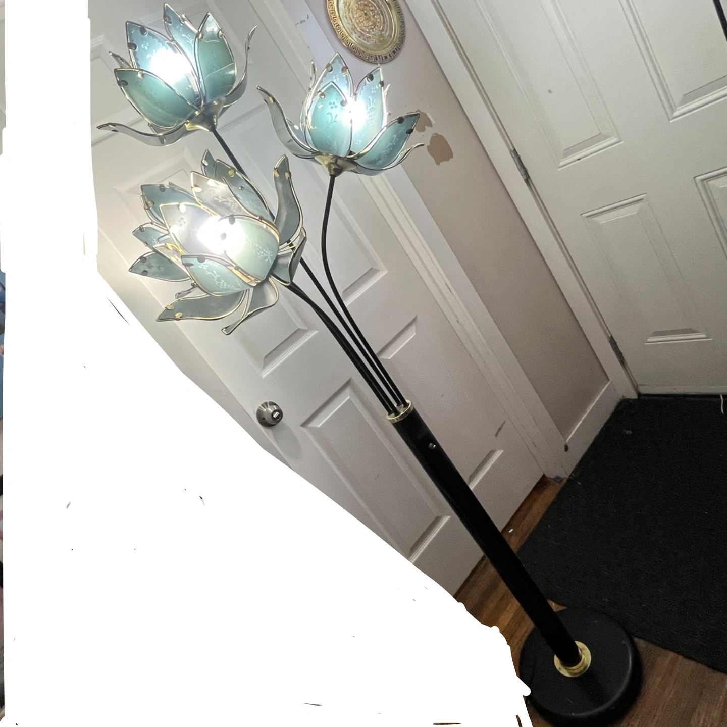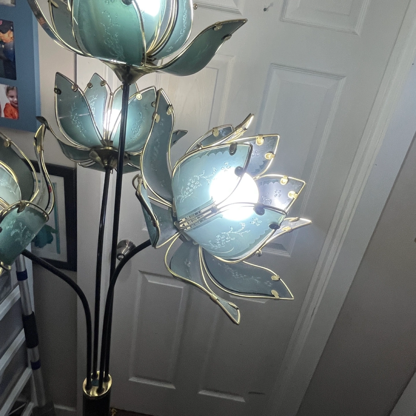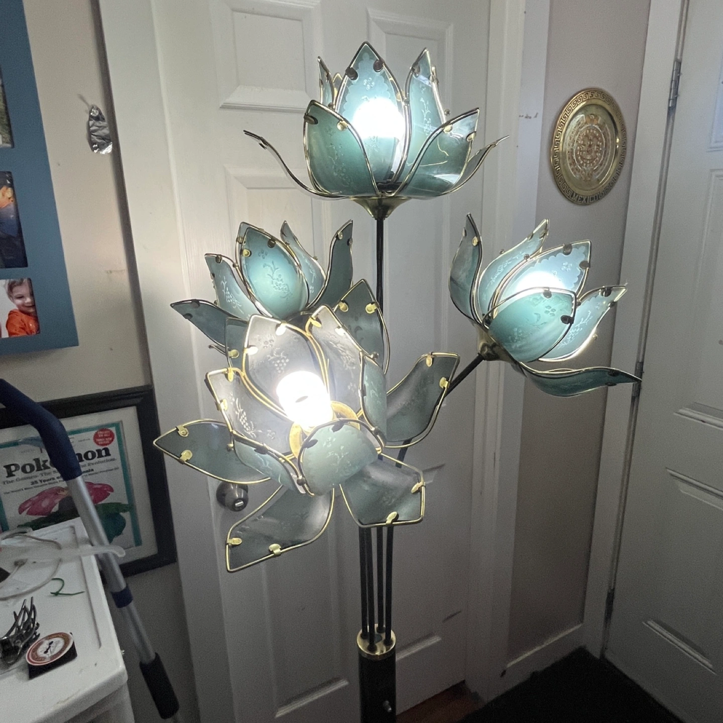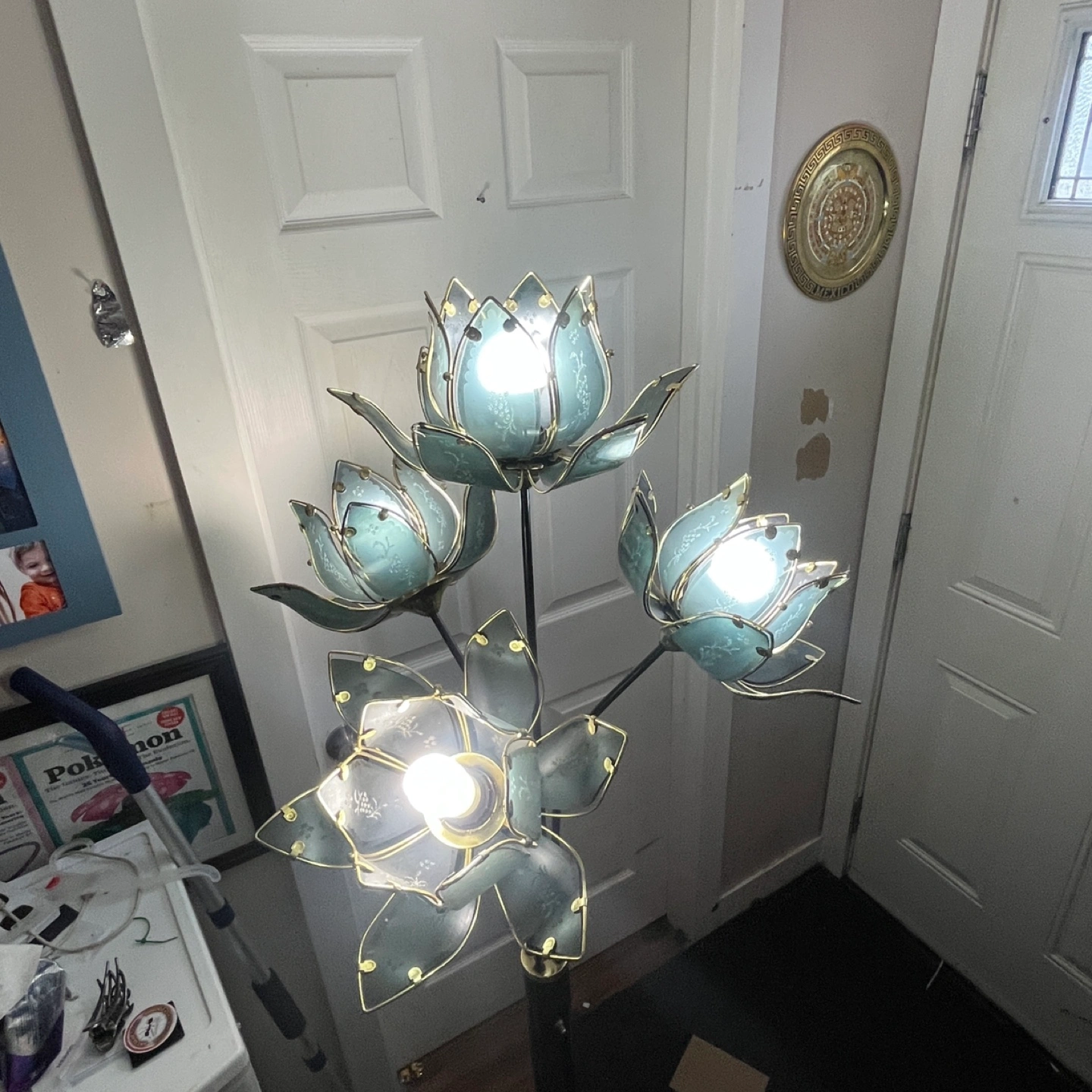 Here's a unique floor lamp featuring a lotus flower design! It adds a touch of elegance to any room. The lamp has multiple flower lights, creating a warm and inviting atmosphere. It's in great shape and ready to brighten up your space!