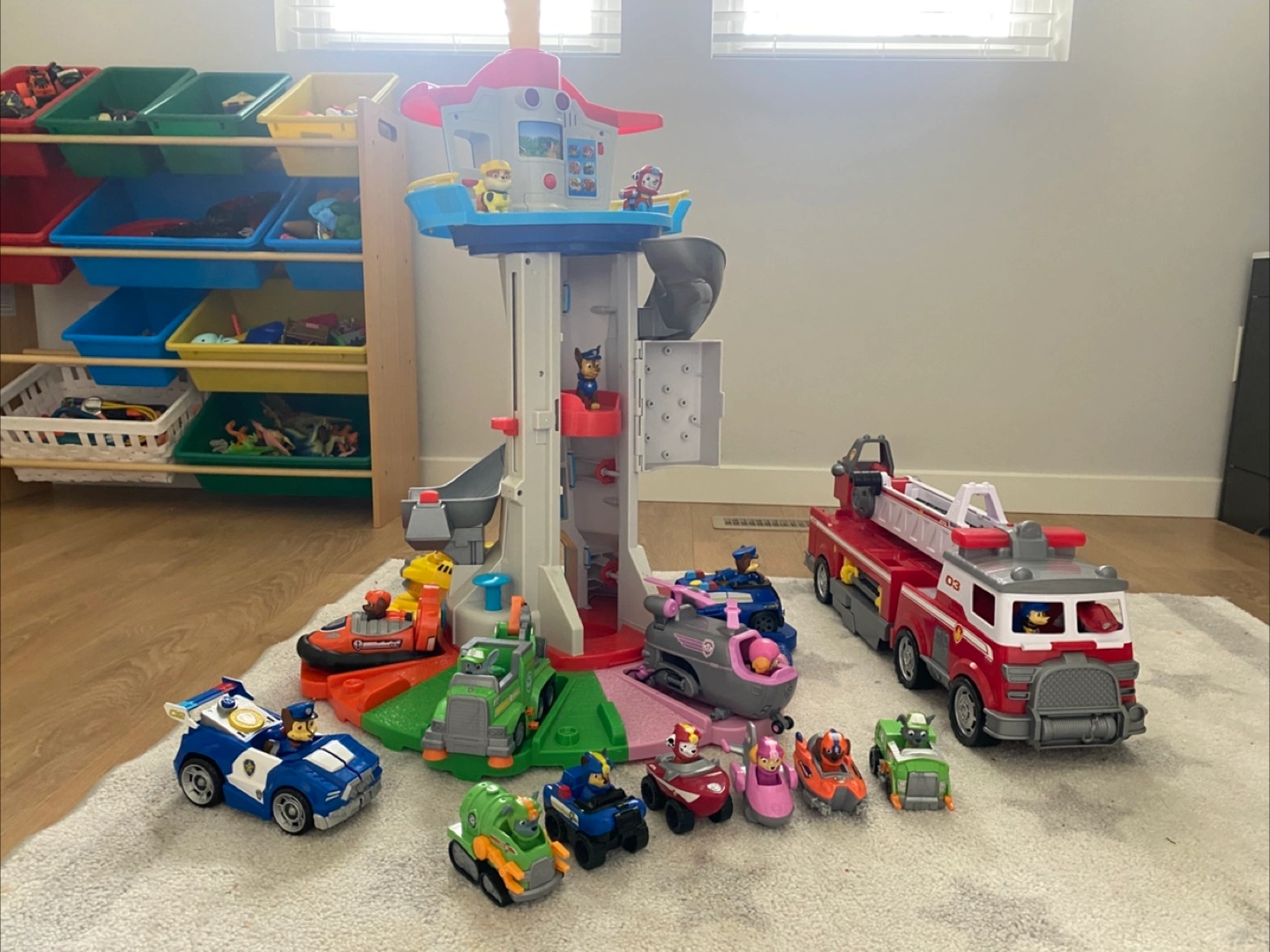 Paw Patrol playset including the lookout tower, several vehicles, dog mini figures and big fire truck. Hours of fun for any Paw Patrol fan. Includes a variety of characters and their corresponding vehicles.