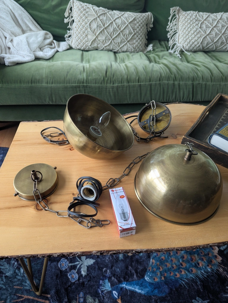 Selling two hanging brass pendant lights! It's never been used with all the parts you need and ready to add a touch of warmth to your space. Includes all the necessary components for installation.