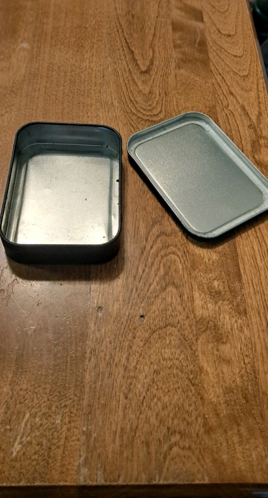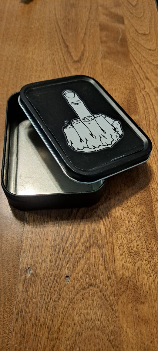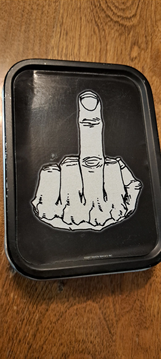 Selling a metal stash box with a unique design from Raven Images Inc. The box is in good condition and perfect for storing small items. It's a cool little box to have!
