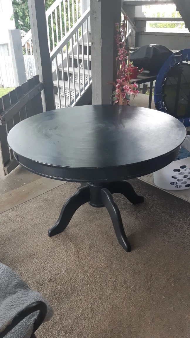 Selling a round wooden table in black. pedistal Legs. 44" diameyer 29 " height. It's in good condition and would be a great addition to any home. pick up location near Southgate mall