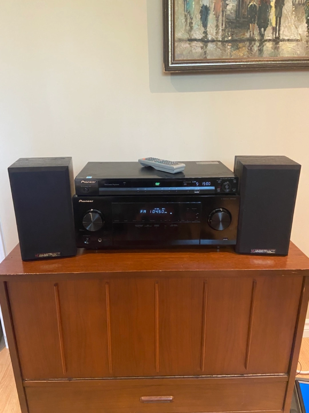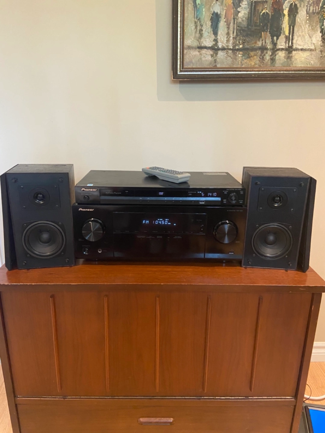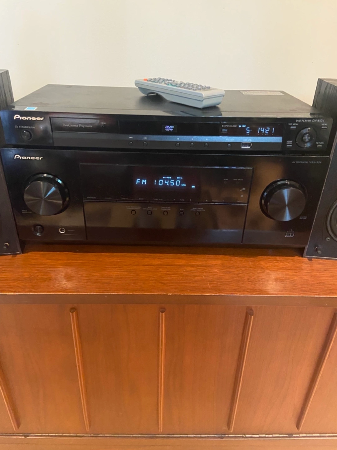Selling a Pioneer VSX-524 receiver with speakers. This home theatre system is perfect for enjoying movies and music with great sound quality. It comes with a remote control for easy operation. The receiver has multiple input options, including HDMI, for connecting various devices.