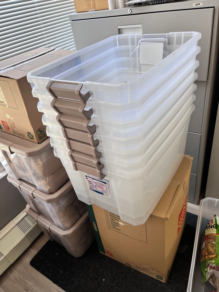 Selling a stack of Sterilite storage bins with lids. They're clear with tan handles, perfect for organizing your stuff! They're in great shape and ready to help you declutter your space