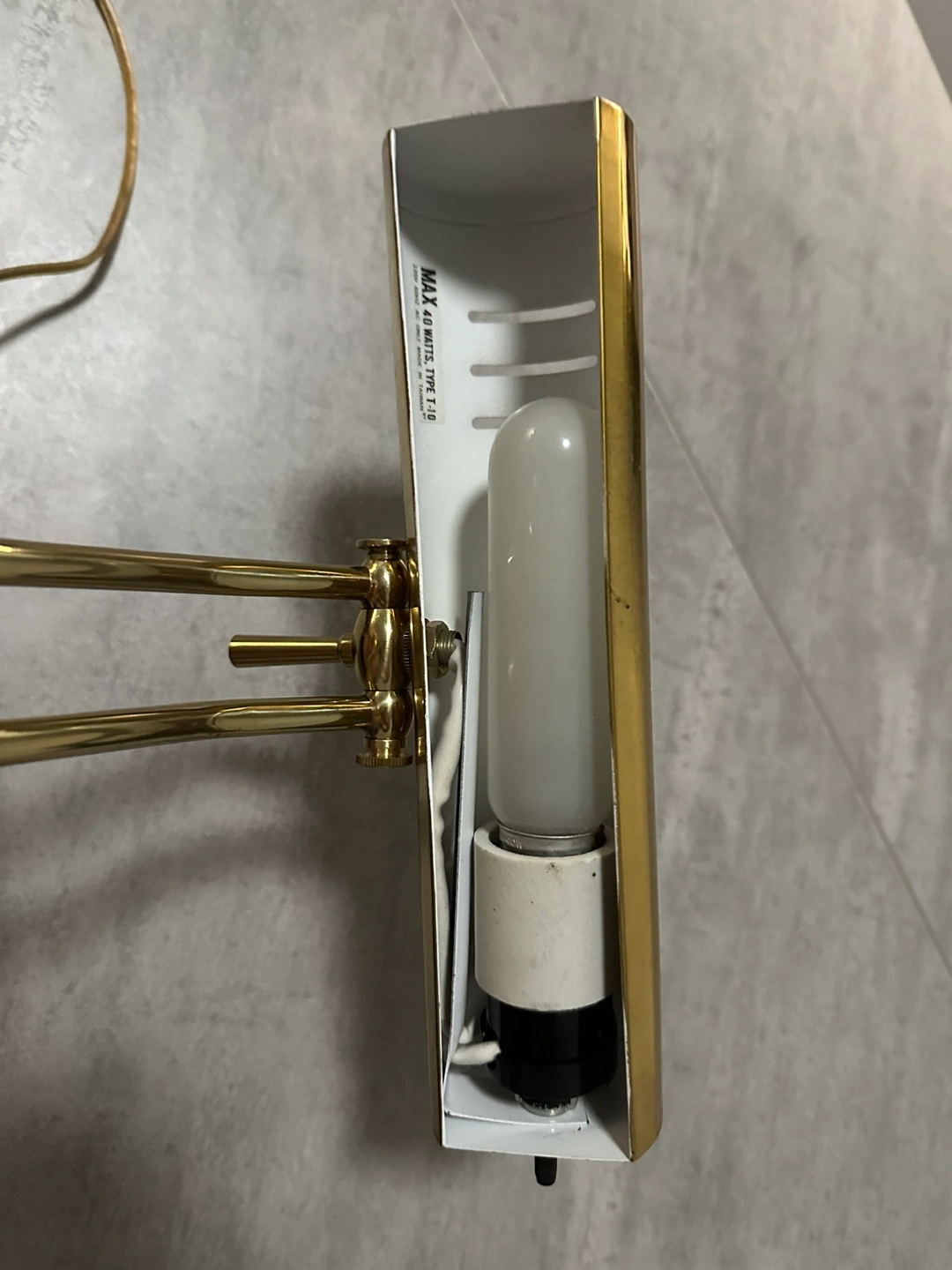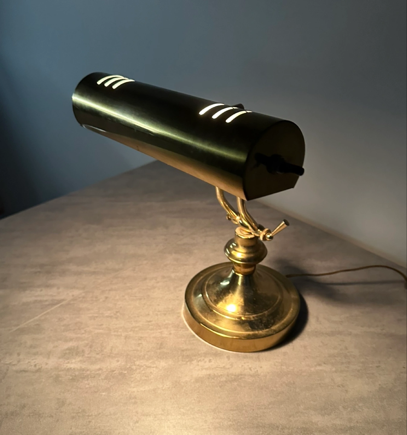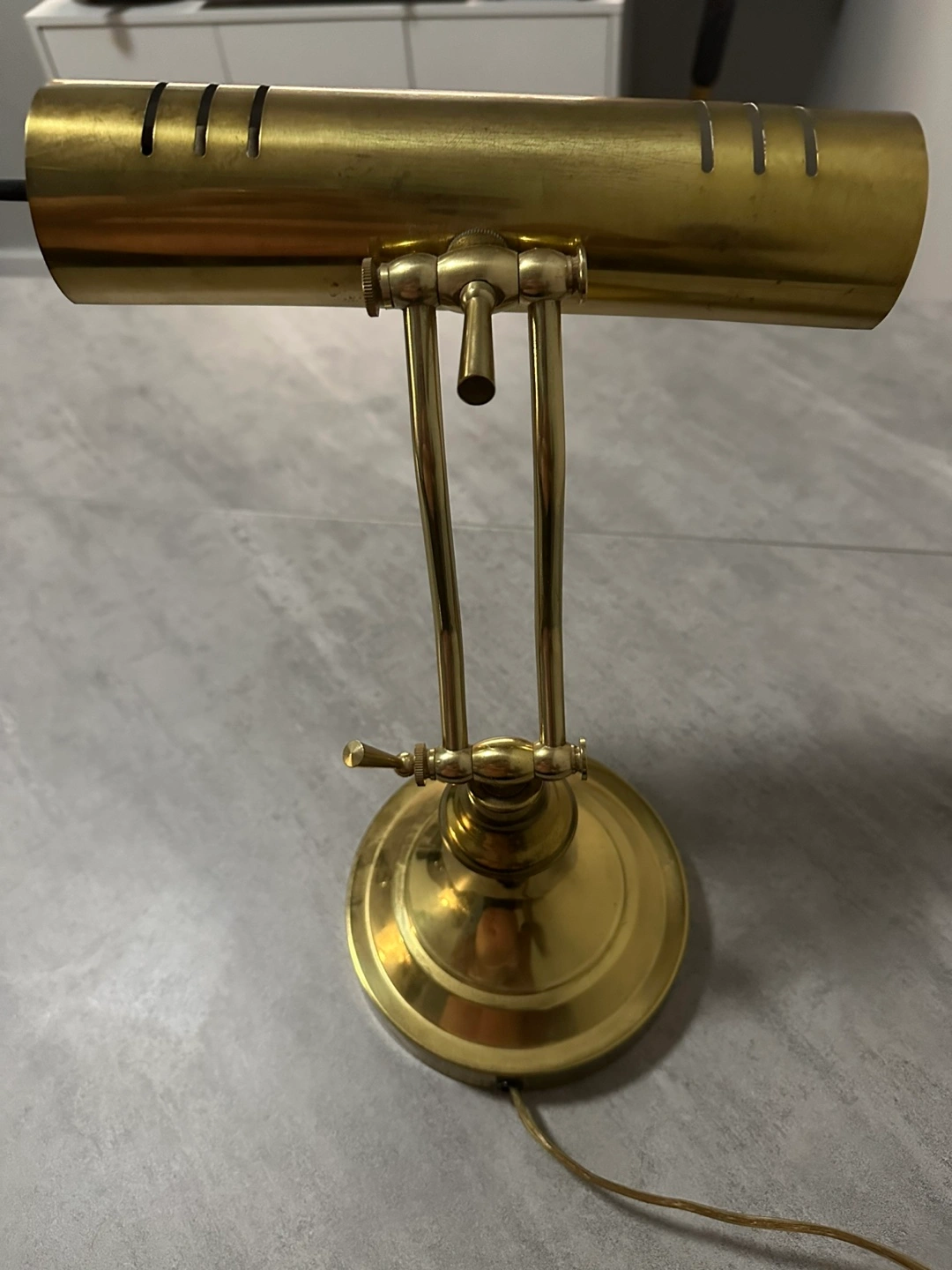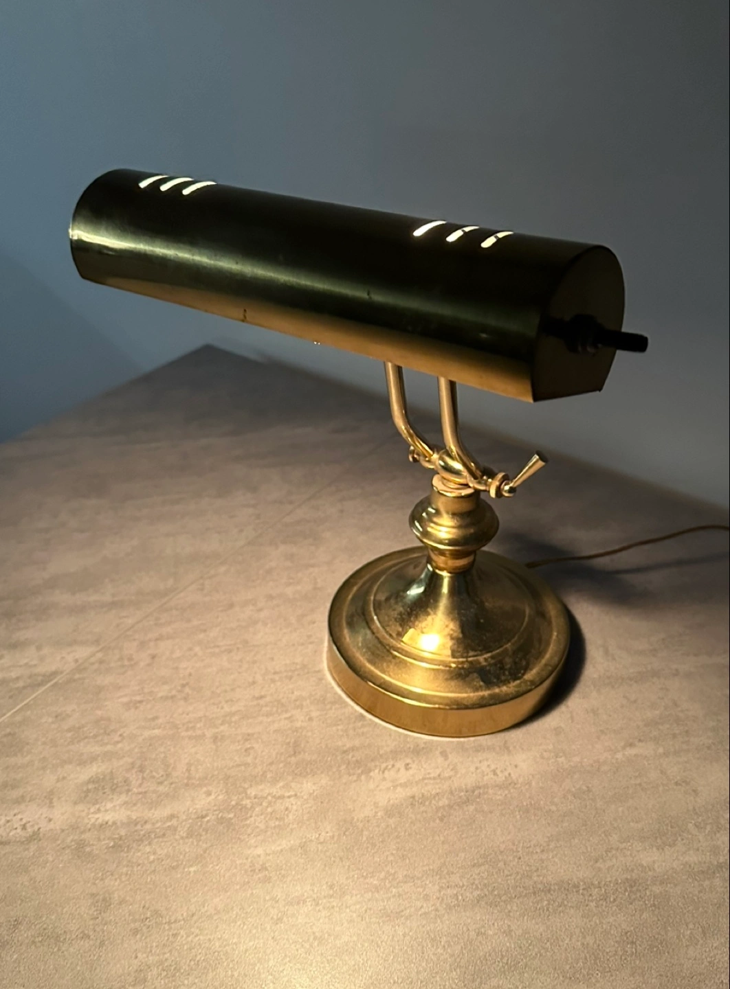 brass piano desk lamp. It's in great shape. It gives off a nice, warm light, perfect for reading or working. 10”w x 12”h x 8”L