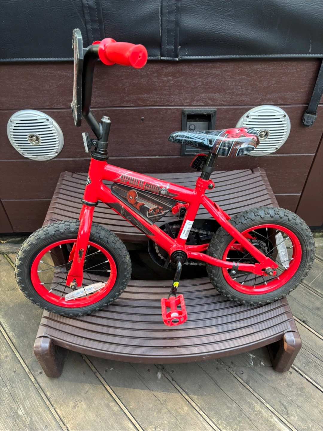 Selling a Huffy Spider-Man kids' bike in red! It's a fun bike for any young Spider-Man fan. The bike is in good condition and ready for a new rider. Perfect for learning to ride or just cruising around the neighbourhood!