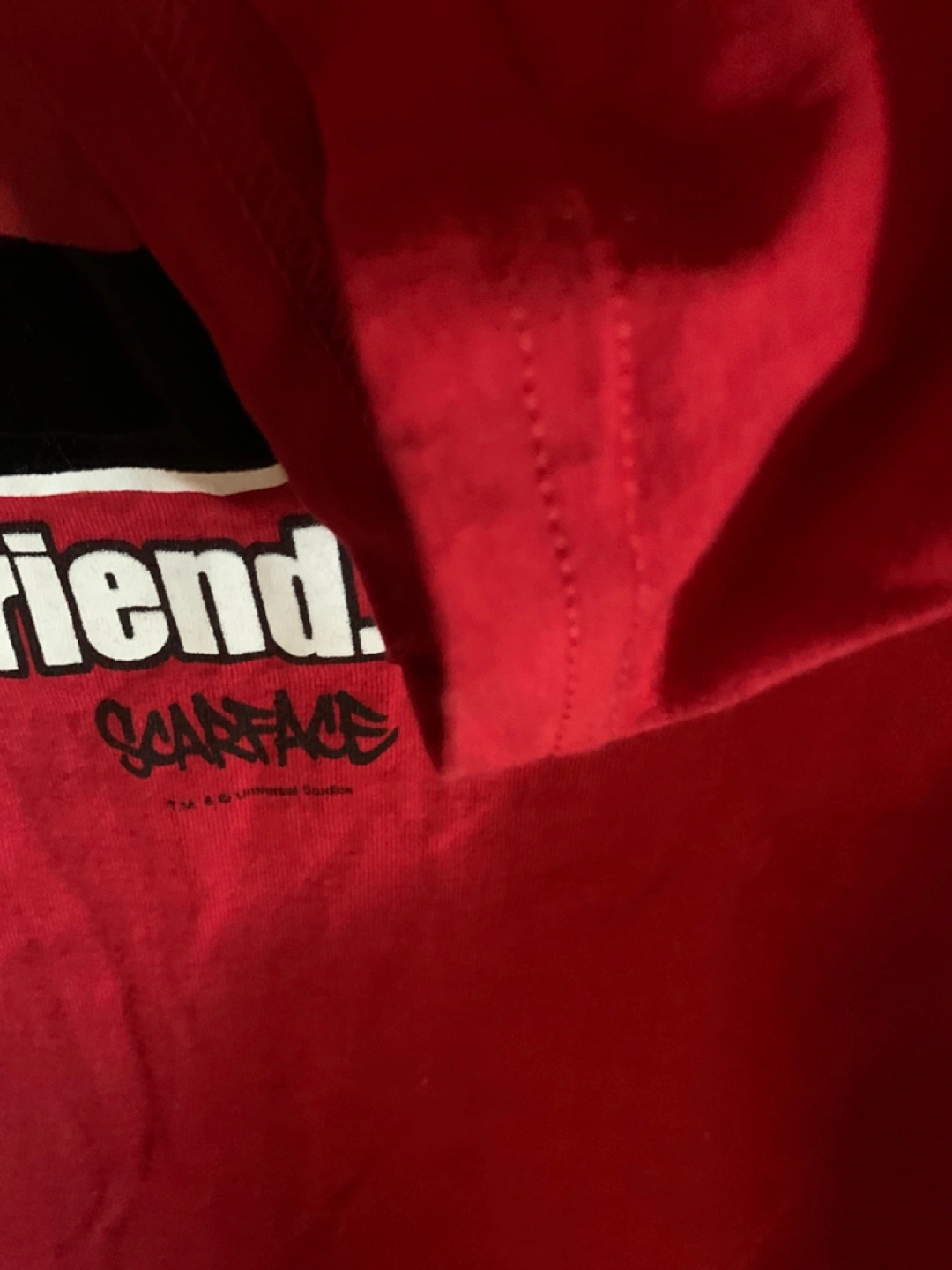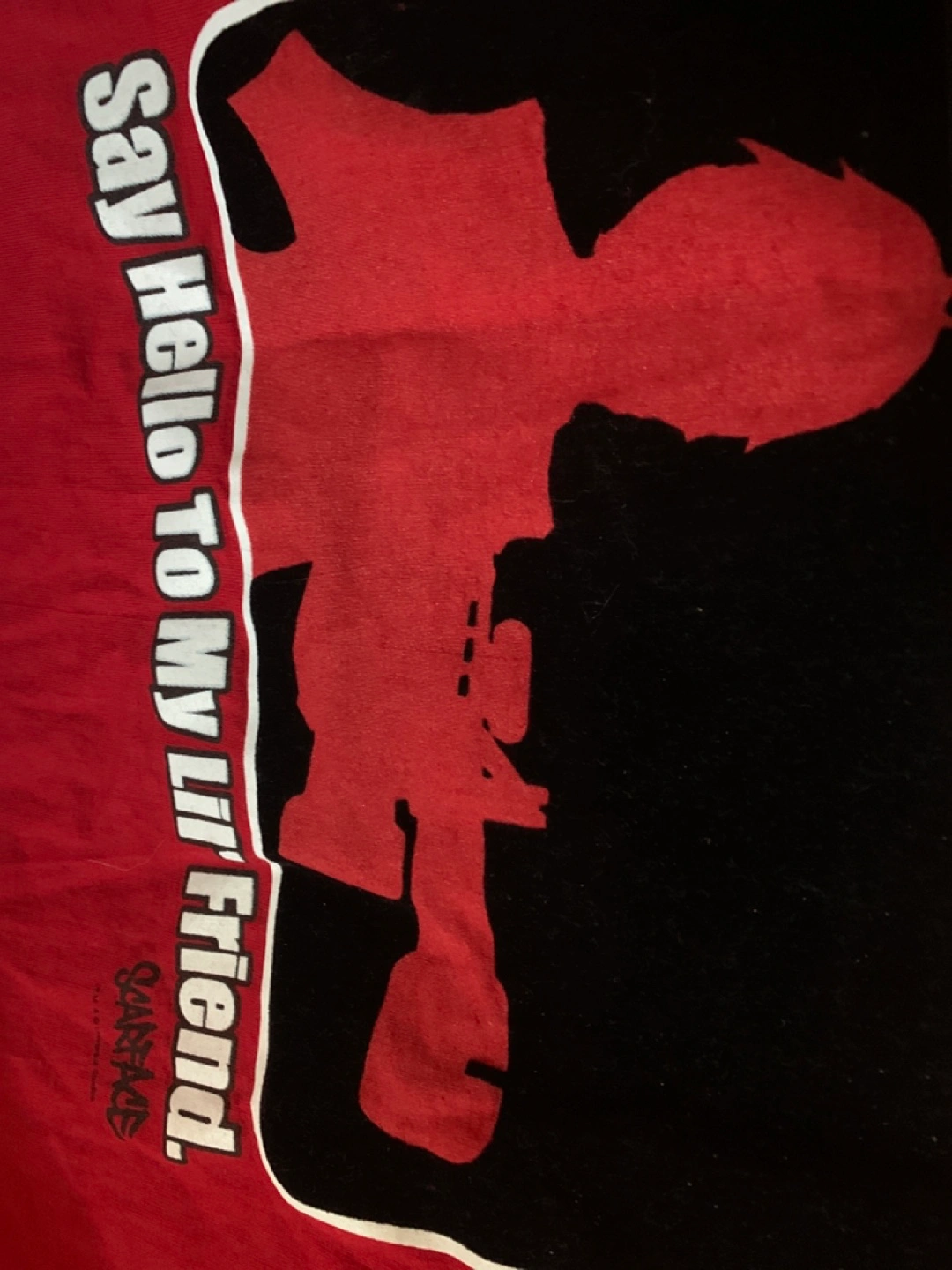 Selling a Scarface graphic tee by M&O Knits! The shirt is red with a black and white graphic print. It's a size L and made of 100% cotton.