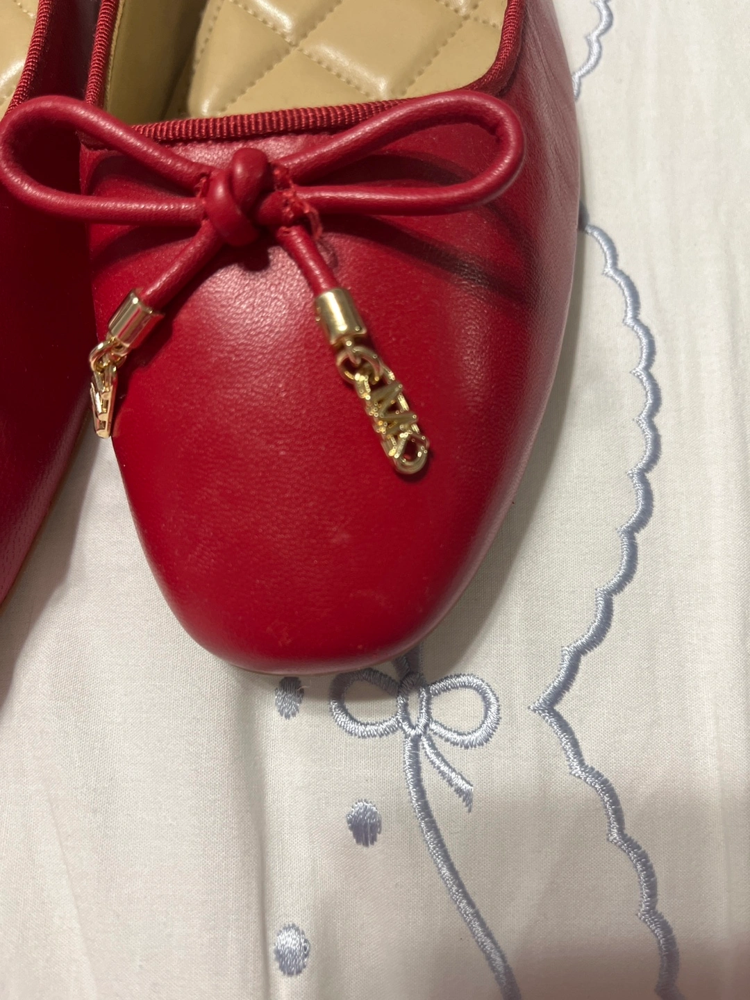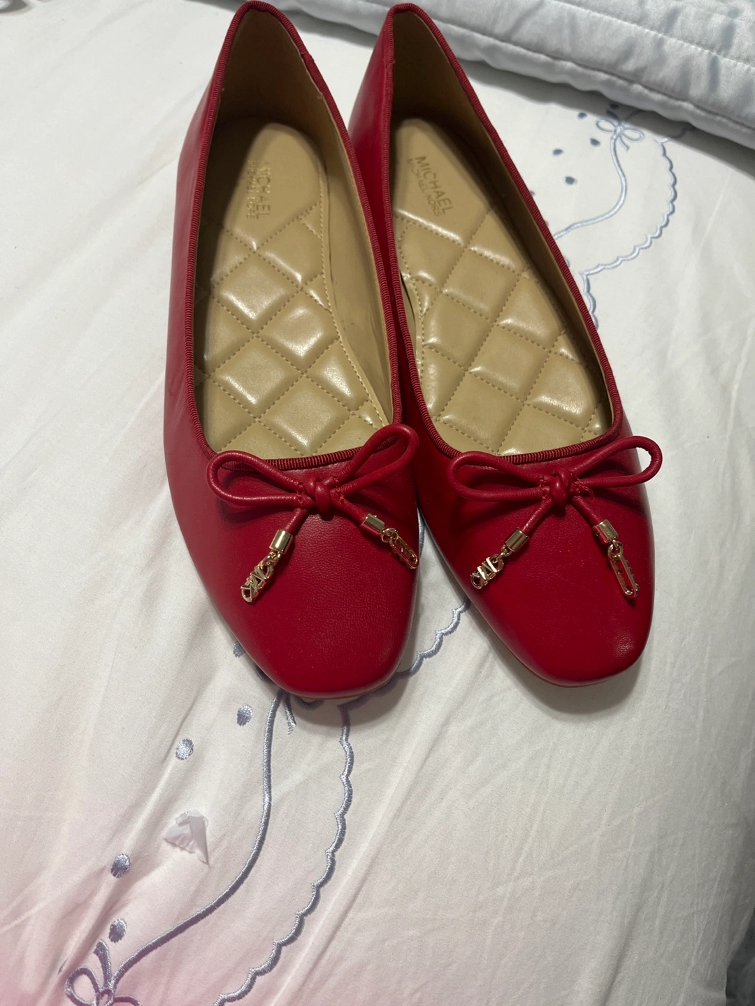 These are a pair of Michael Kors ballet flats in a beautiful red color. They feature a cute bow detail on the front. Perfect for adding a pop of color to your outfit!