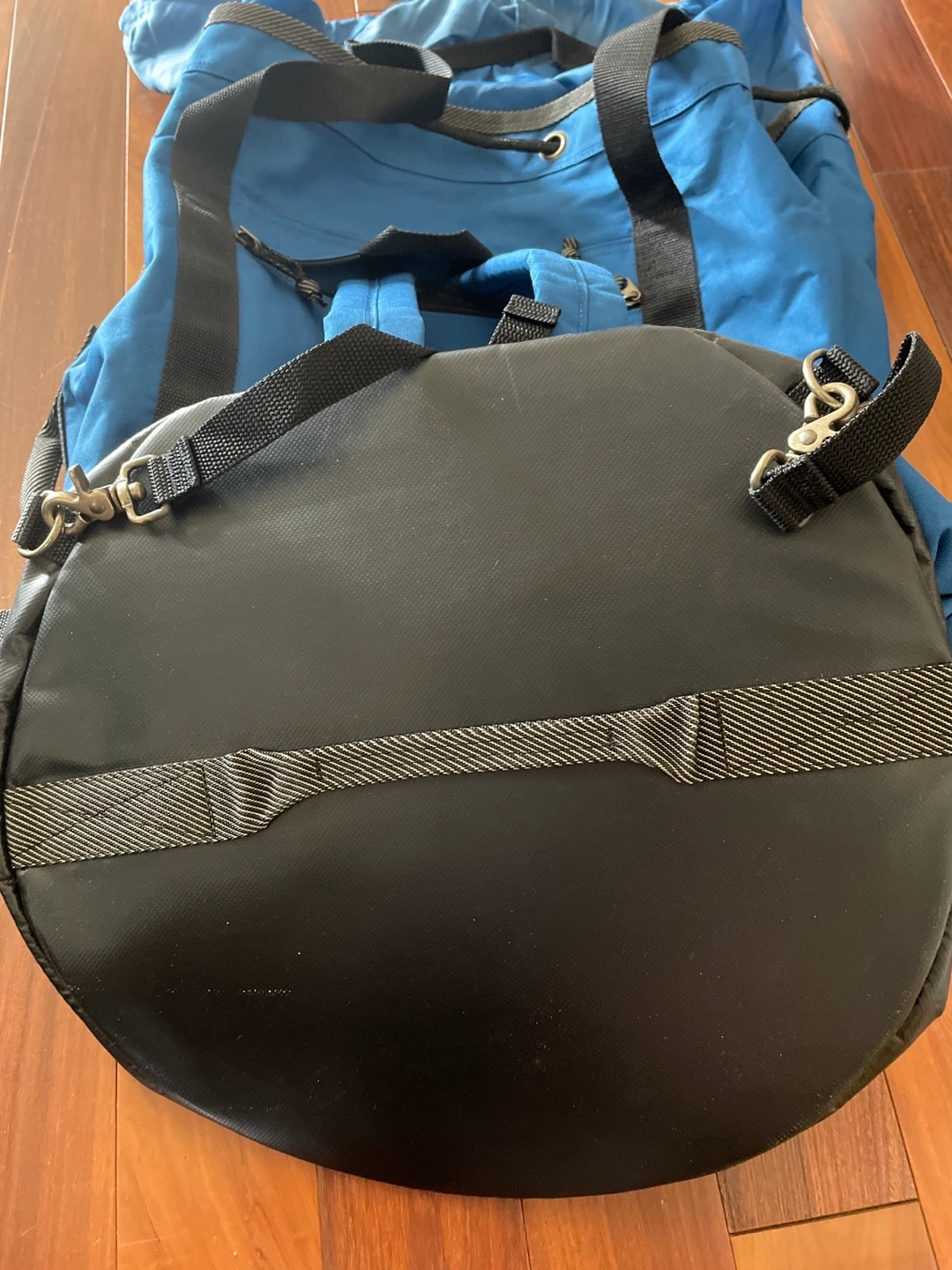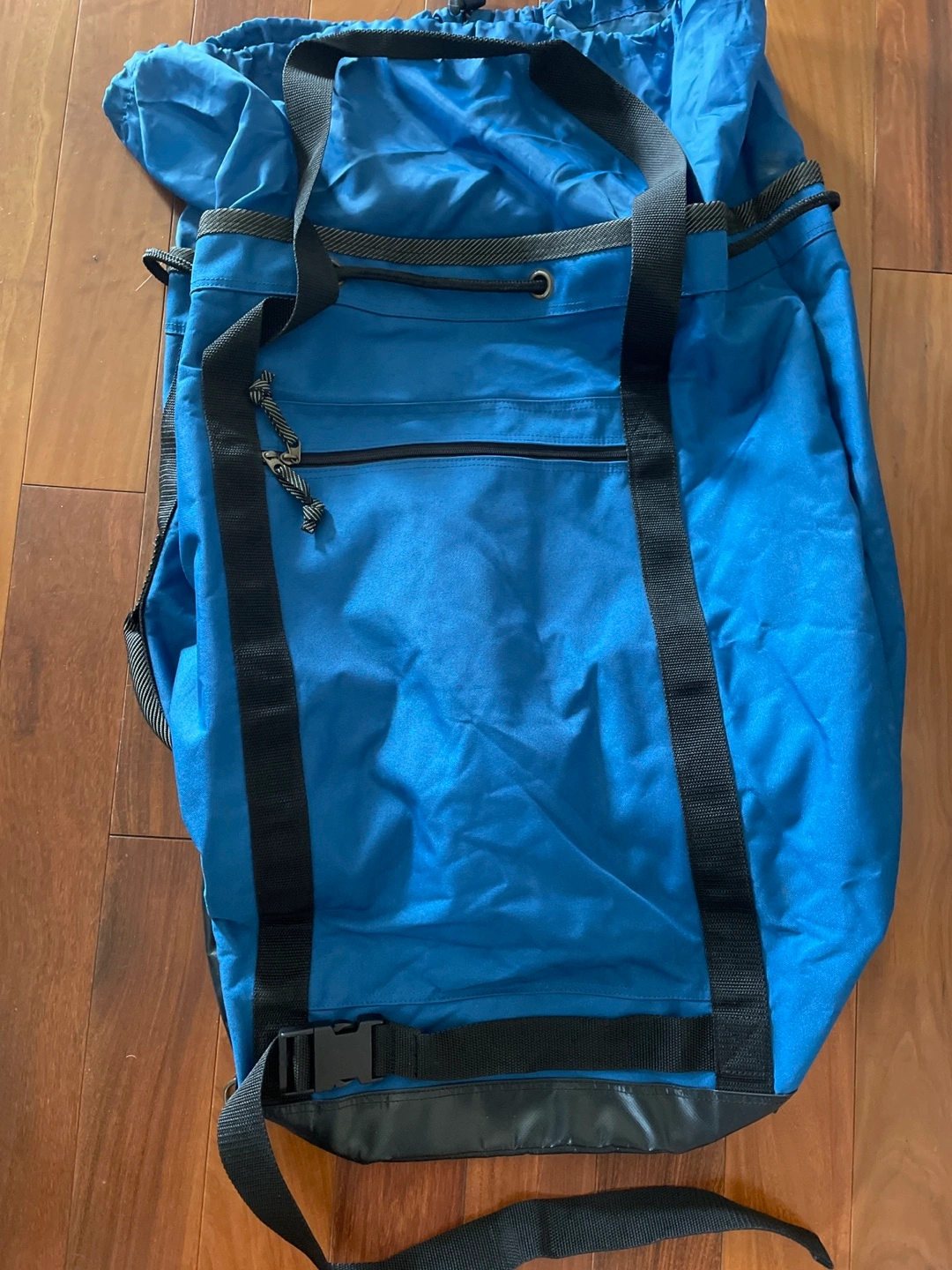 Selling a blue duffel backpack. It's in good condition and ready for your next adventure! The bag features black straps and accents, and a drawstring closure. Perfect for travel or sports gear or camping,durable material.