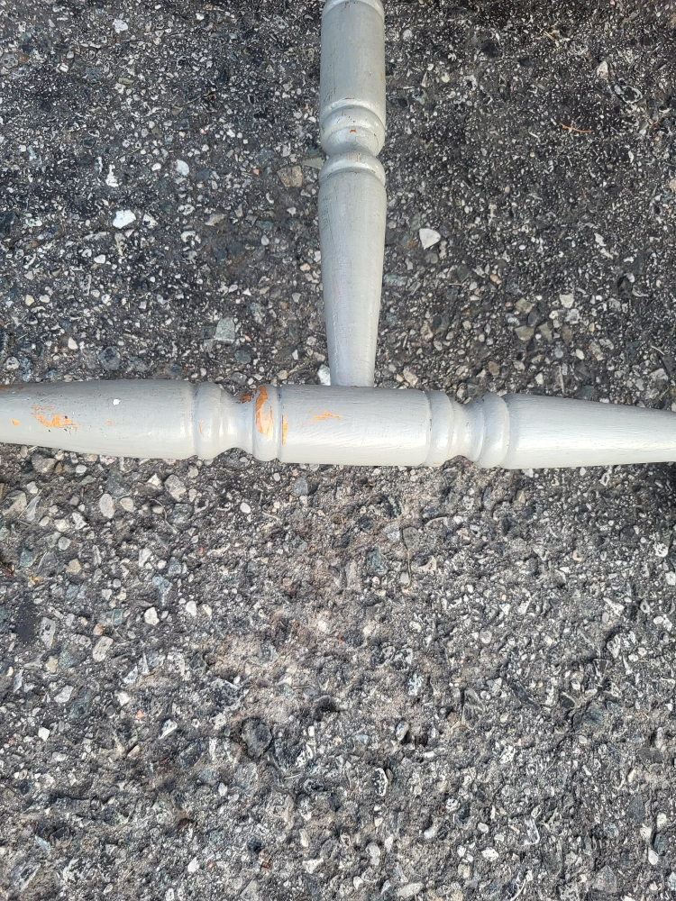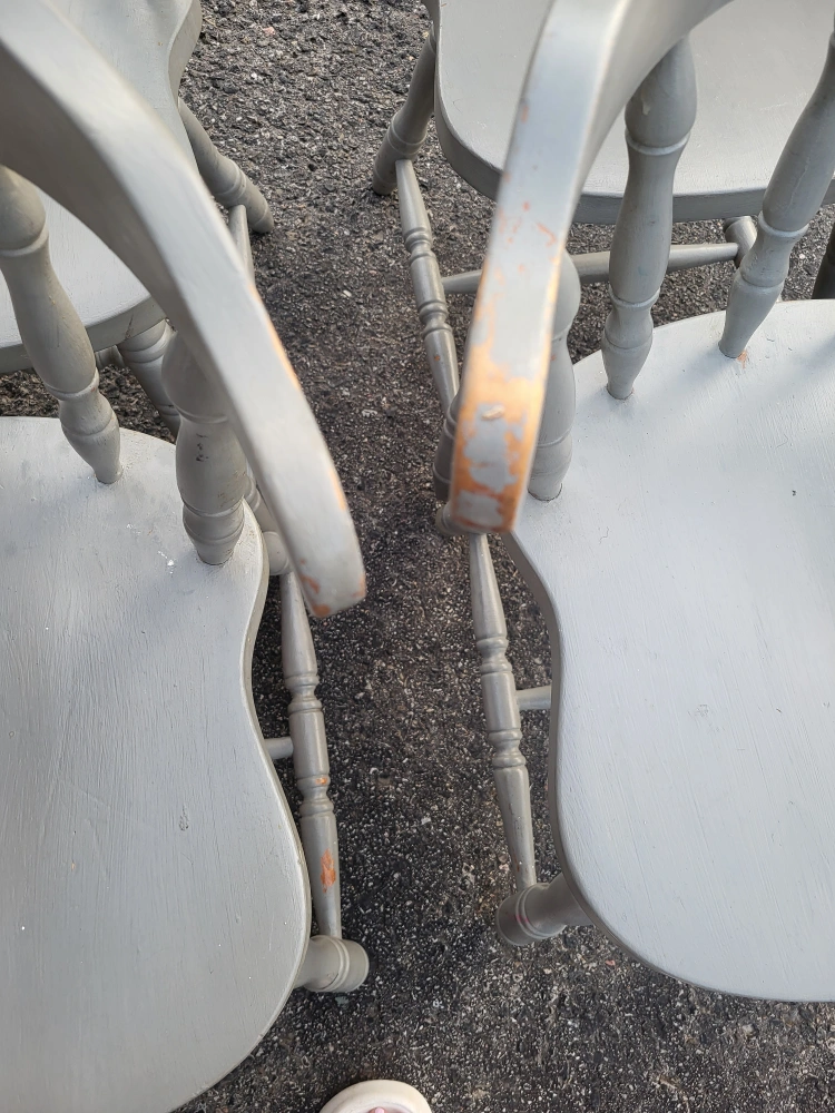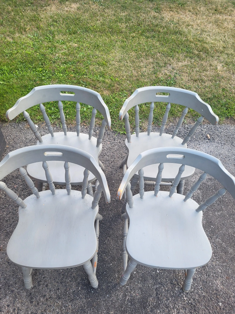 Set of four soild wood chairs. Currrntly chalk painted in a light grey colour. But these are a DIY'ers dream as the signs of wear and tear, as shown in the photos can easily be transformed!