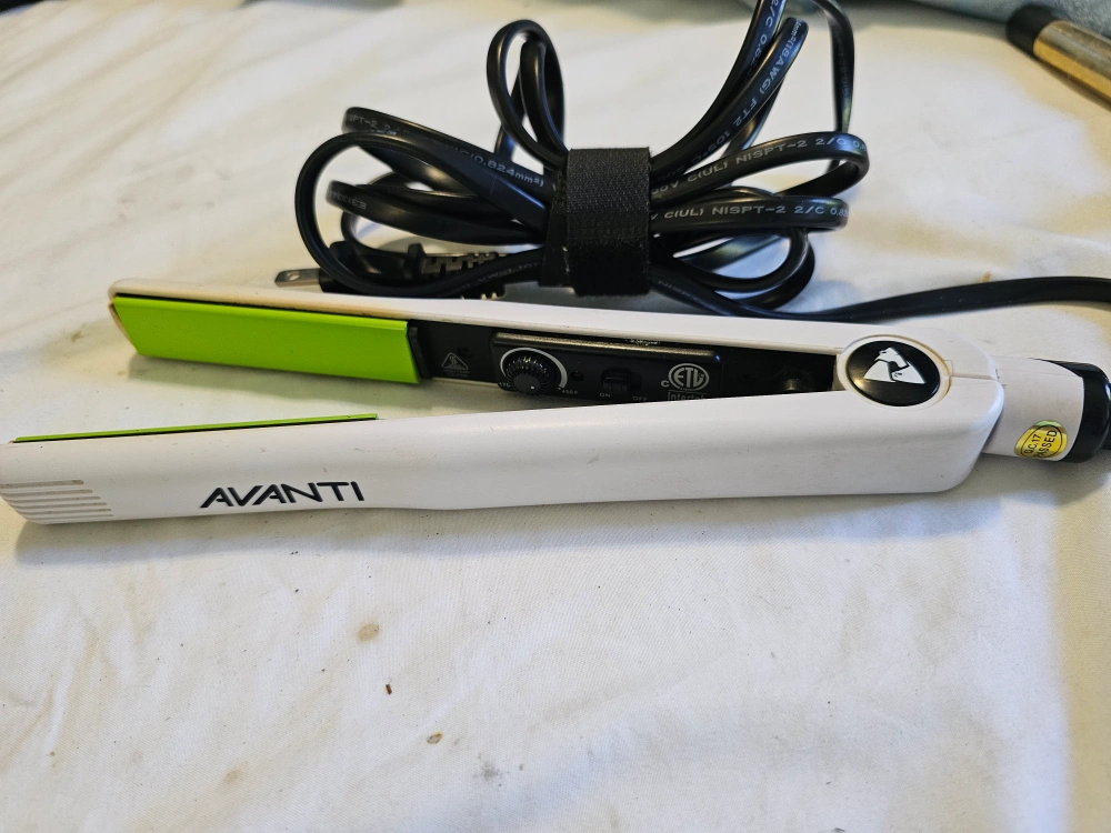 Selling a used Avanti hair straightener. It's white with green accents on the plates. It's in good working condition and ready for a new home!
