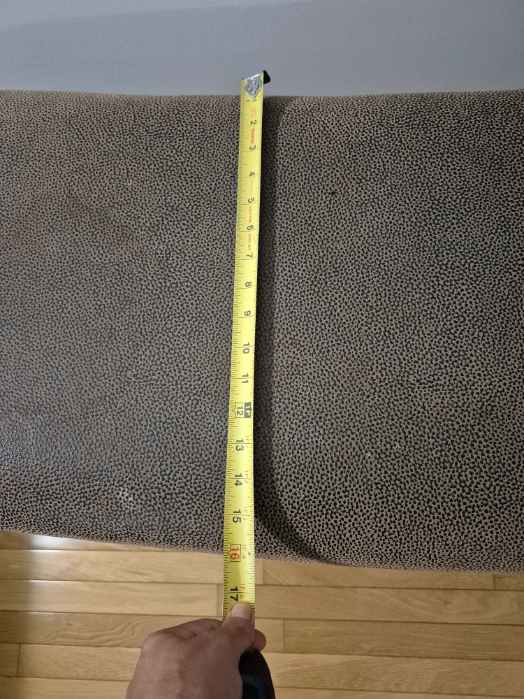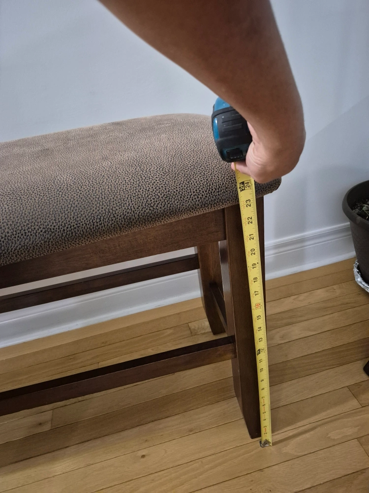 Here's a sturdy upholstered bench for sale! It's about 47 inches long and 24 inches high. The seat has a brown textured finish, and the legs are a dark brown colour. It would be perfect for an entryway or extra seating at the dining table