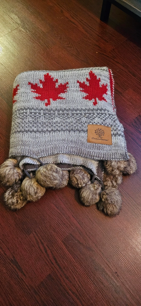 Cozy Canadian blanket featuring a lovely maple leaf design! It's in great condition and would be perfect for snuggling up on the couch. The blanket also has pom-poms on the edges, adding a touch of whimsy to your home decor.