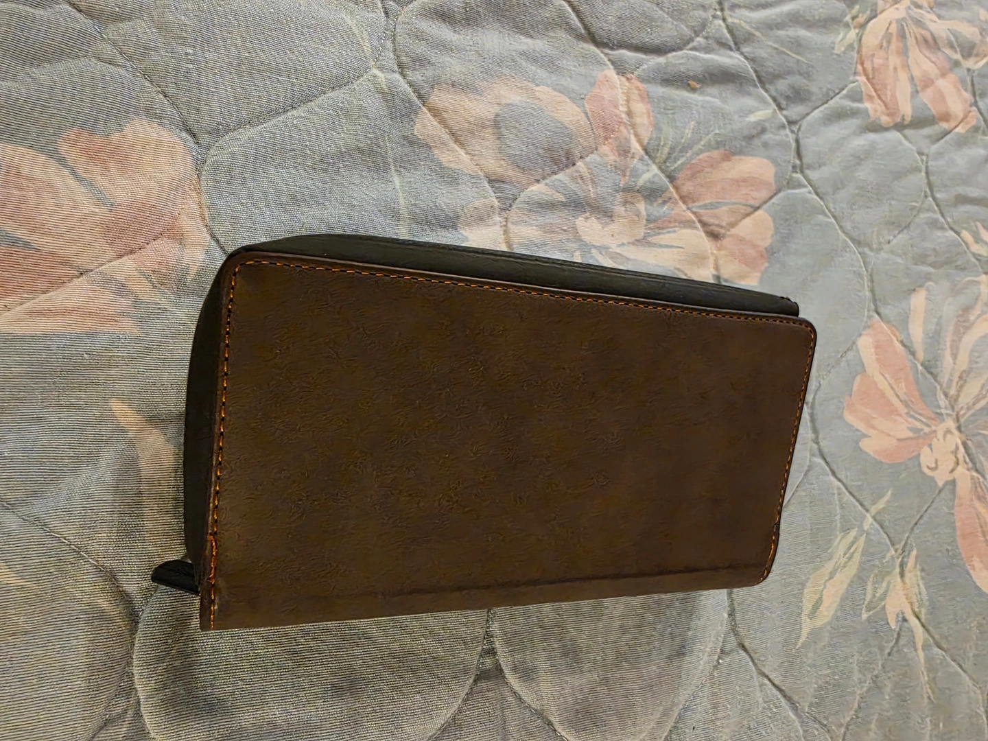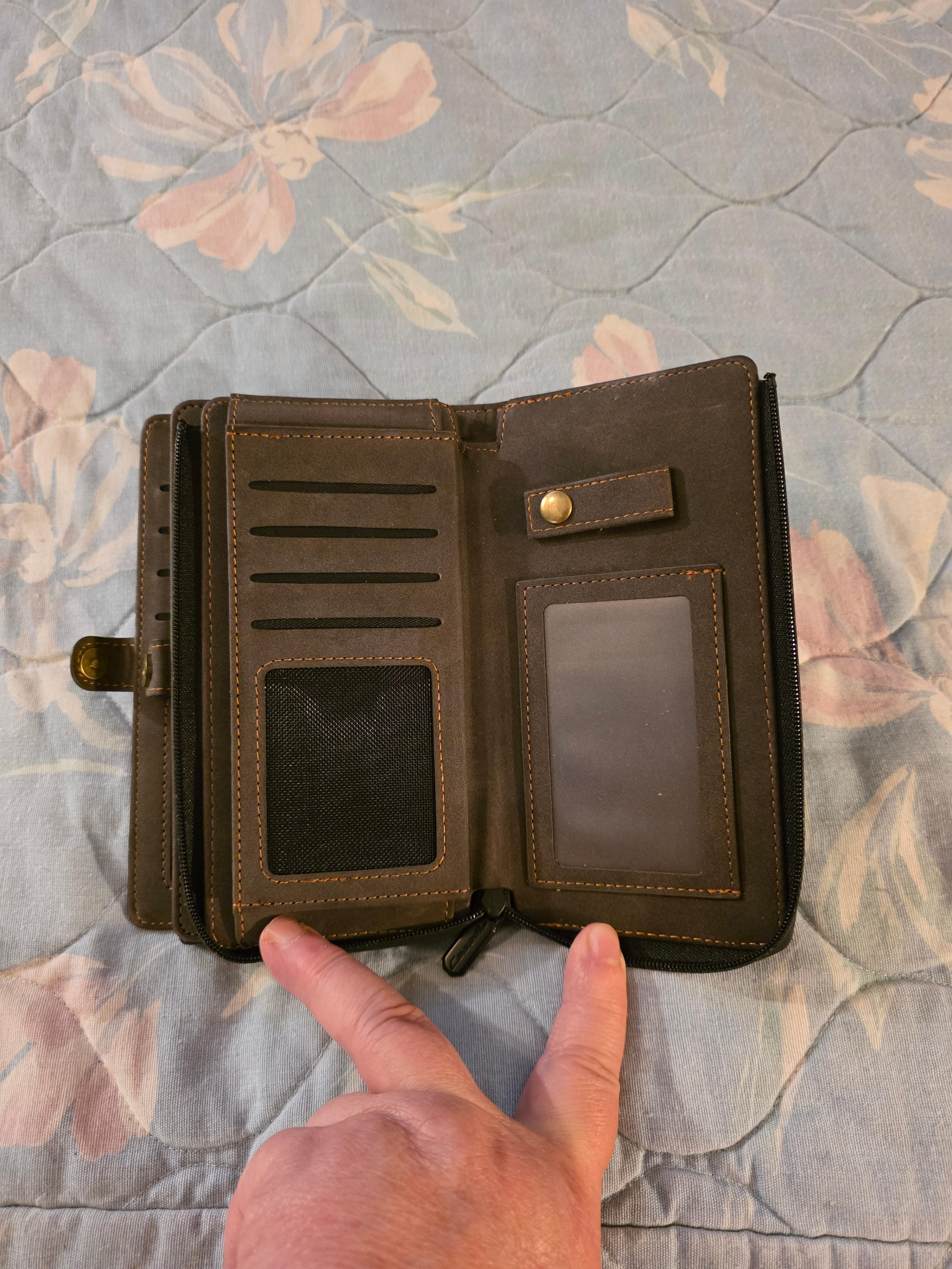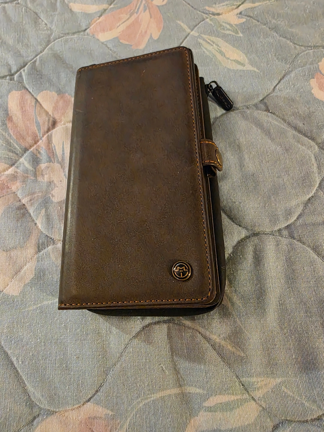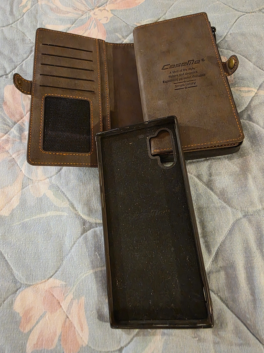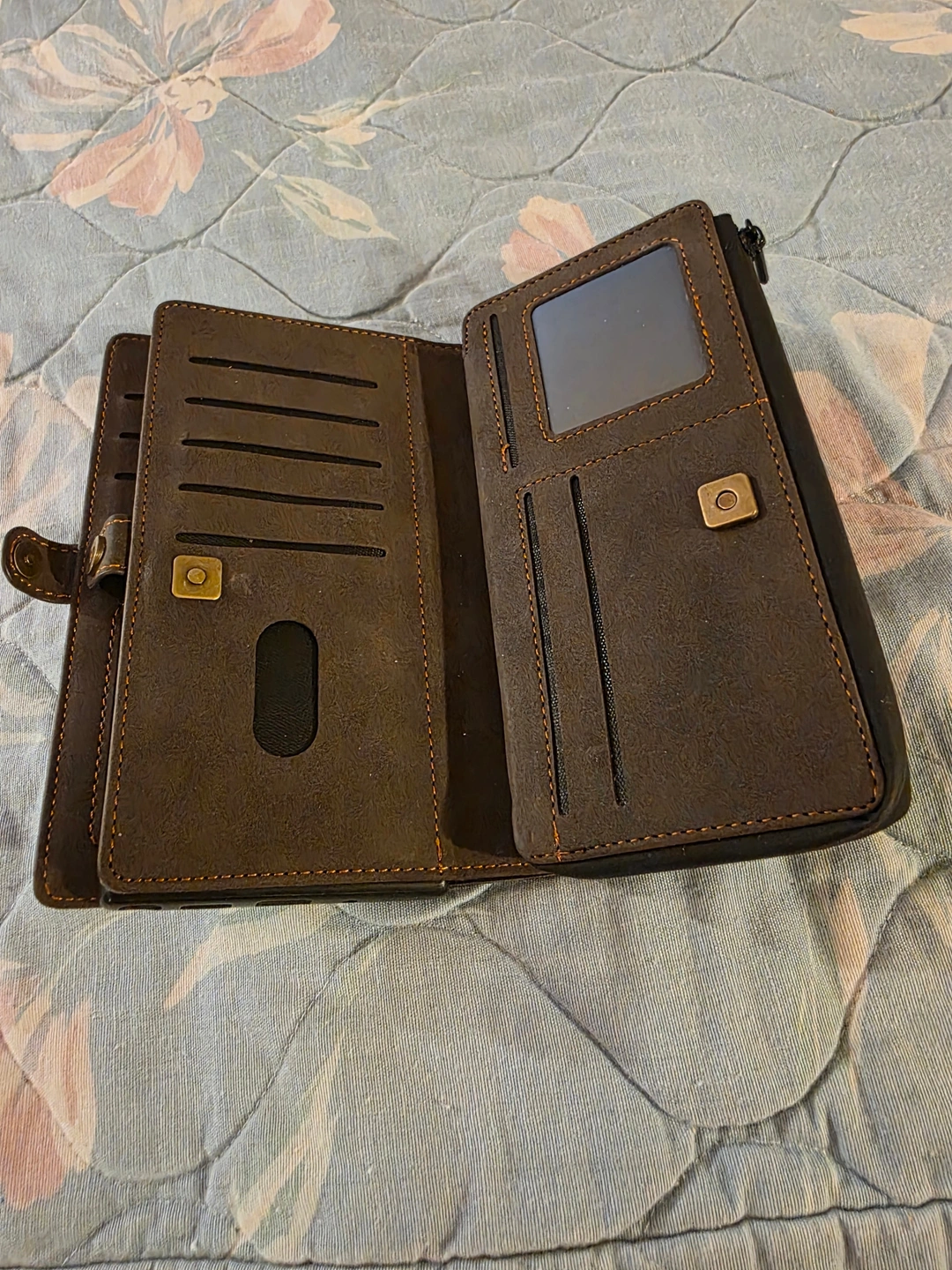Brown Samsung Galaxy Cell Case and Wallet combination. Has room for 16 cards as well as cash. The cell case is magnetic and can be removed from the wallet very easily.