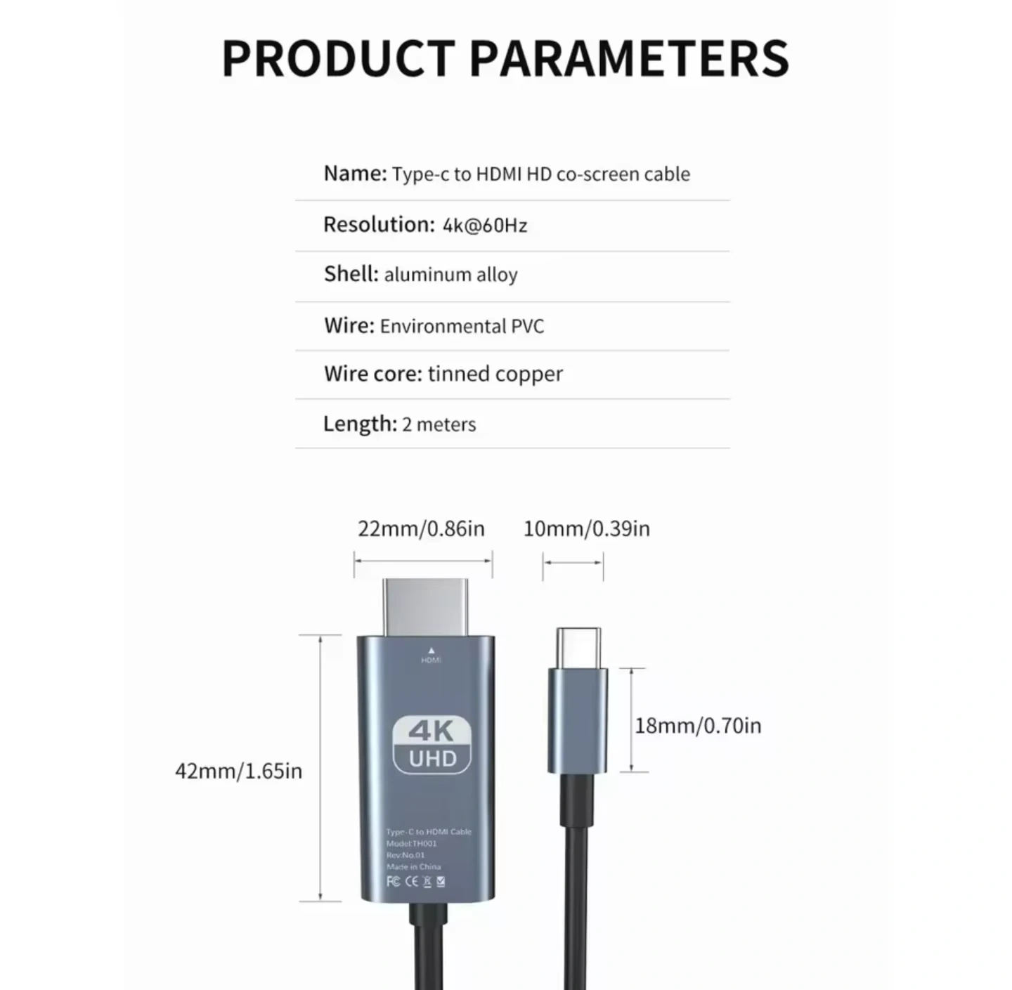 USB C to HDMI HD co-screen cable, 2m, 4K 60Hz