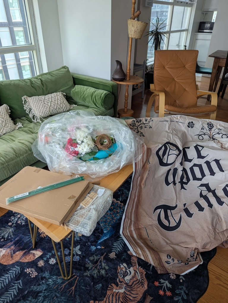 Selling our wedding decorations. Includes floral arrangement materials, wooden pegs, and a backdrop with 'Once Upon a Time' printed on it.