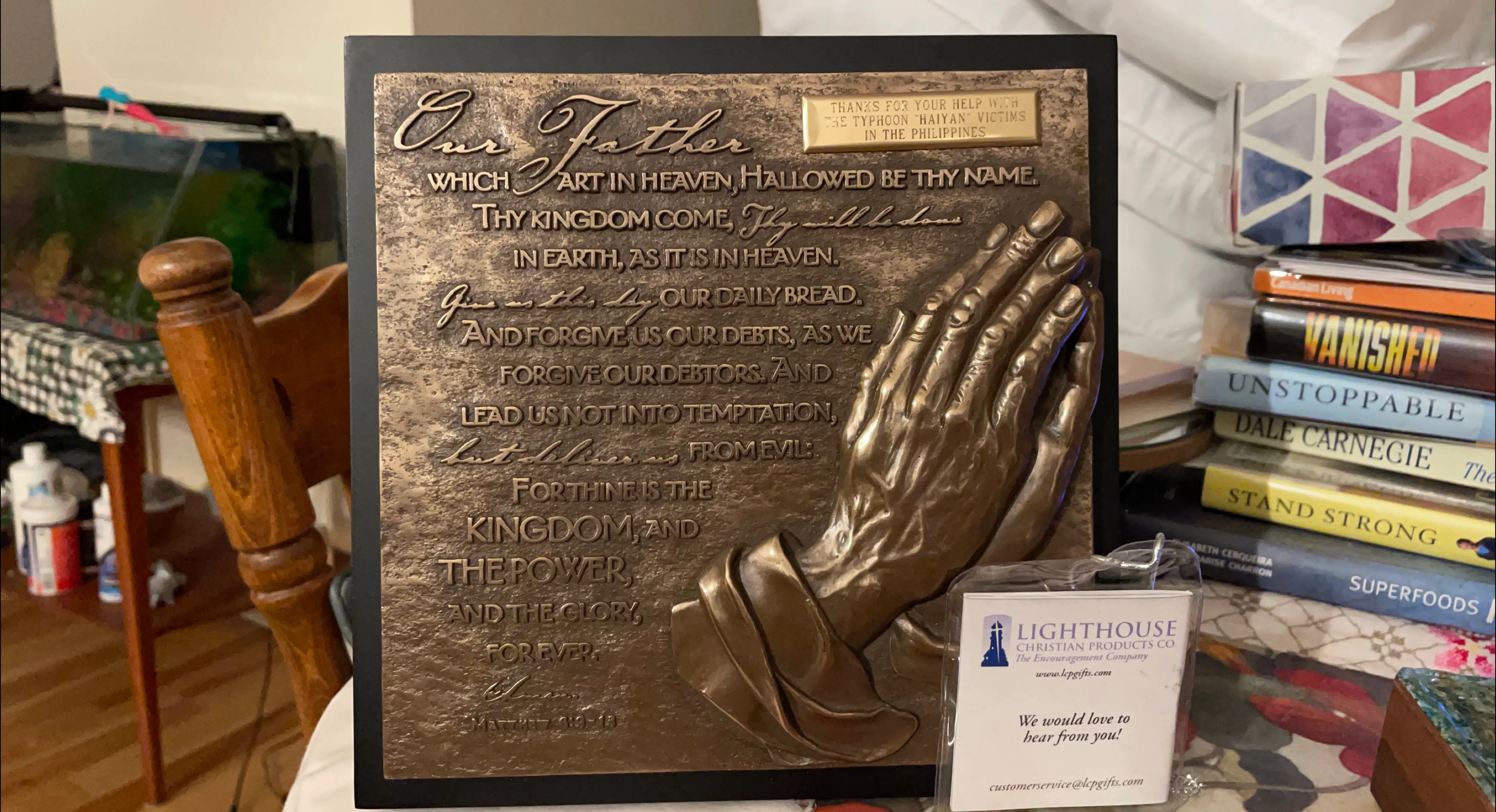 A beautiful 'Our Father' prayer plaque from Lighthouse Christian Products. It features raised hands and the prayer etched into a bronze-coloured background. A lovely piece for any home!
