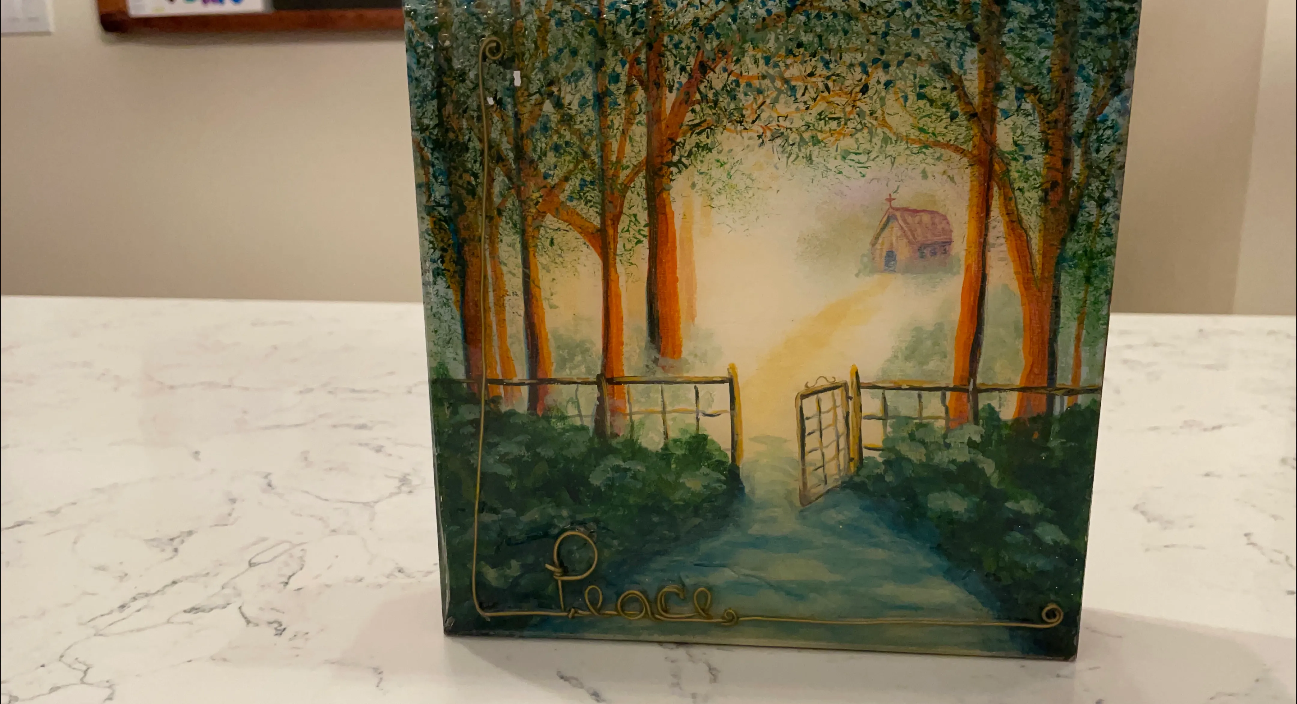 This is a hand-painted block with a peaceful forest scene. The word "Peace" is written on the bottom front. It would look great in any room!