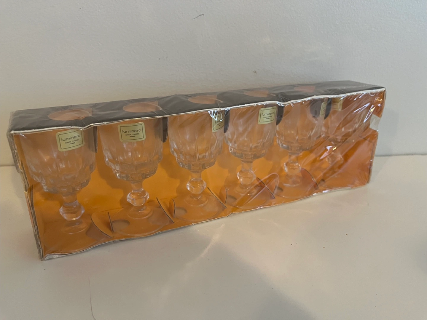 I have a brand new set of Luminarc Lance glasses for sale! This set includes six glasses, still sealed in the original packaging. Made in France, these glasses are perfect for adding a touch of vintage charm to your table setting