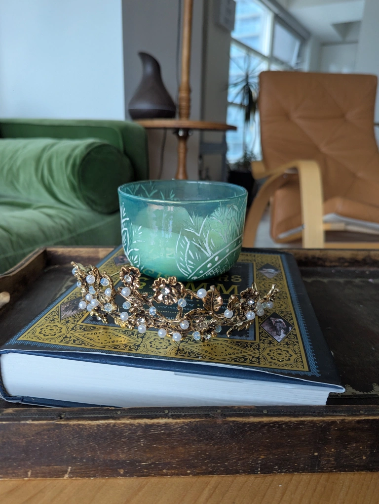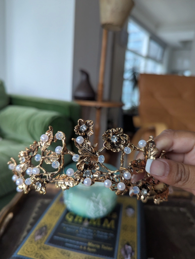 Selling a beautiful gold-tone crown adorned with floral and pearl accents. It's perfect for adding a touch of elegance to any outfit or special occasion. It's in great condition and ready for a new home!