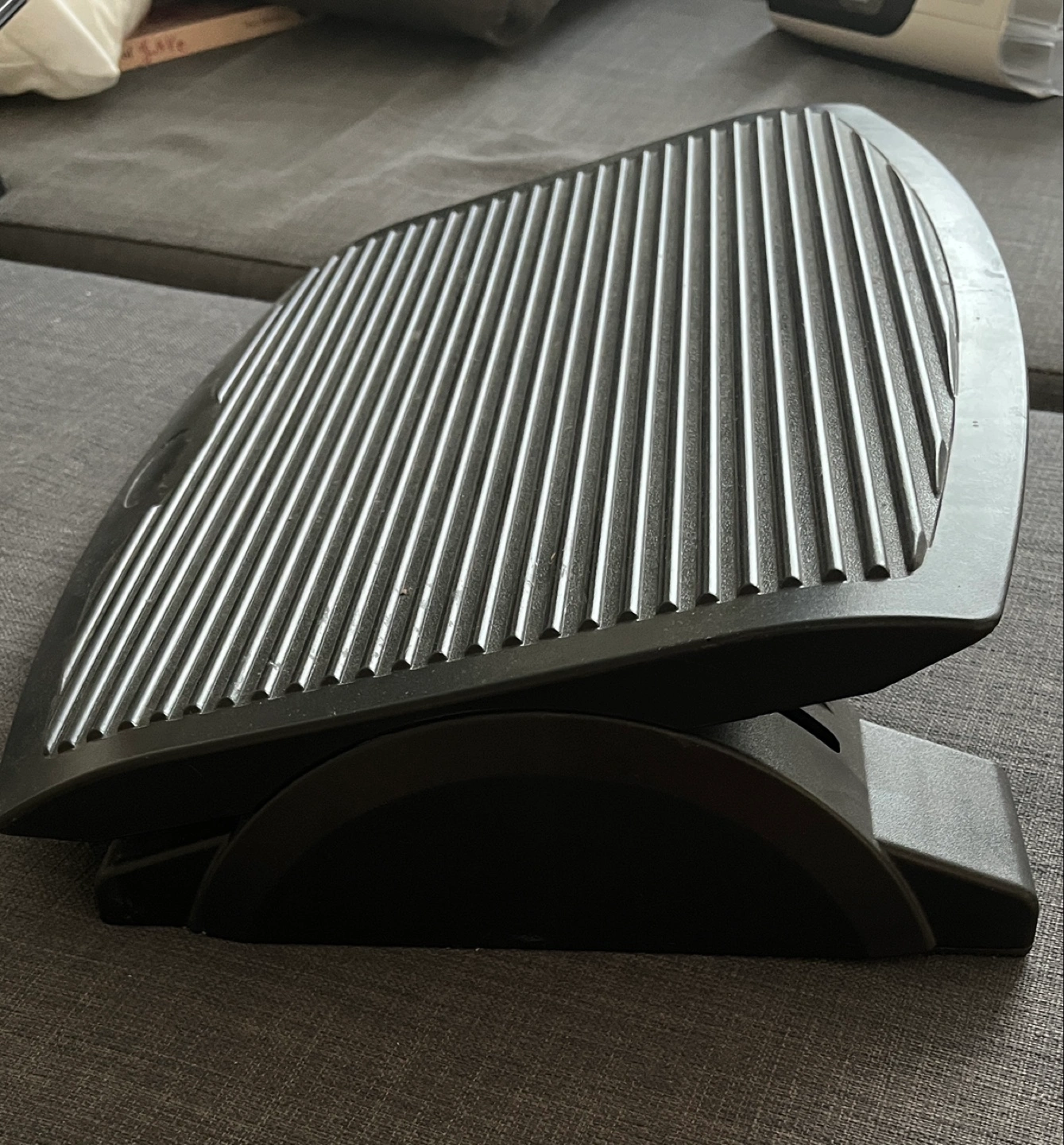 I'm selling a gently used black adjustable foot rest. It's in great condition and ready to help you get comfy at your desk or workspace. It has a textured surface to prevent slipping and is easily adjustable to your preferred angle.