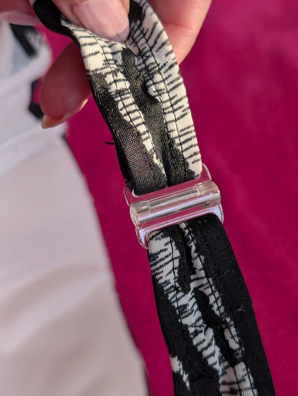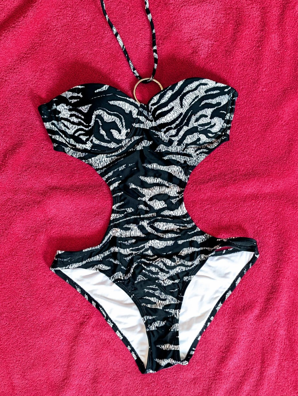 Used gently for the few days only, washed, black and white tiger print one piece monokini. Cut-out design. Halter neck strap with metal ring detail. Great for summer.