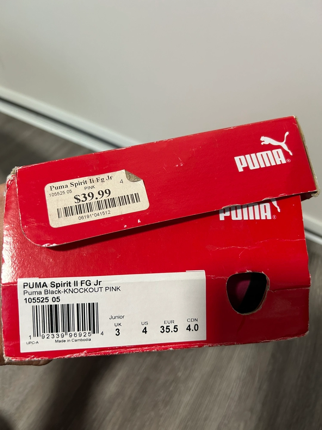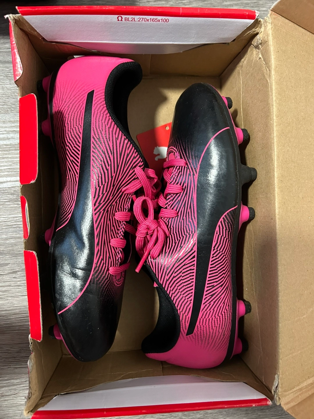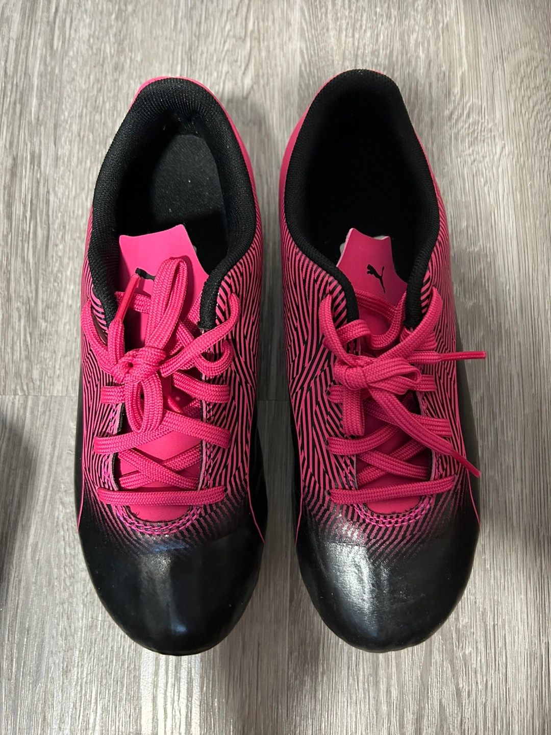 Selling a pair of Puma Spirit II FG Jr soccer cleats in black and knockout pink. They are a US size 4. Comes with the original box! Originally bought for $39.99