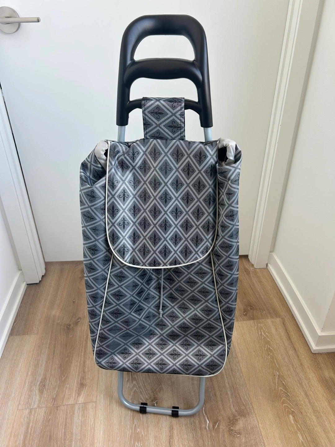 132Here's a handy shopping cart on wheels! It's perfect for carrying groceries or anything else you need to tote around. The cart is in good condition and ready to roll!