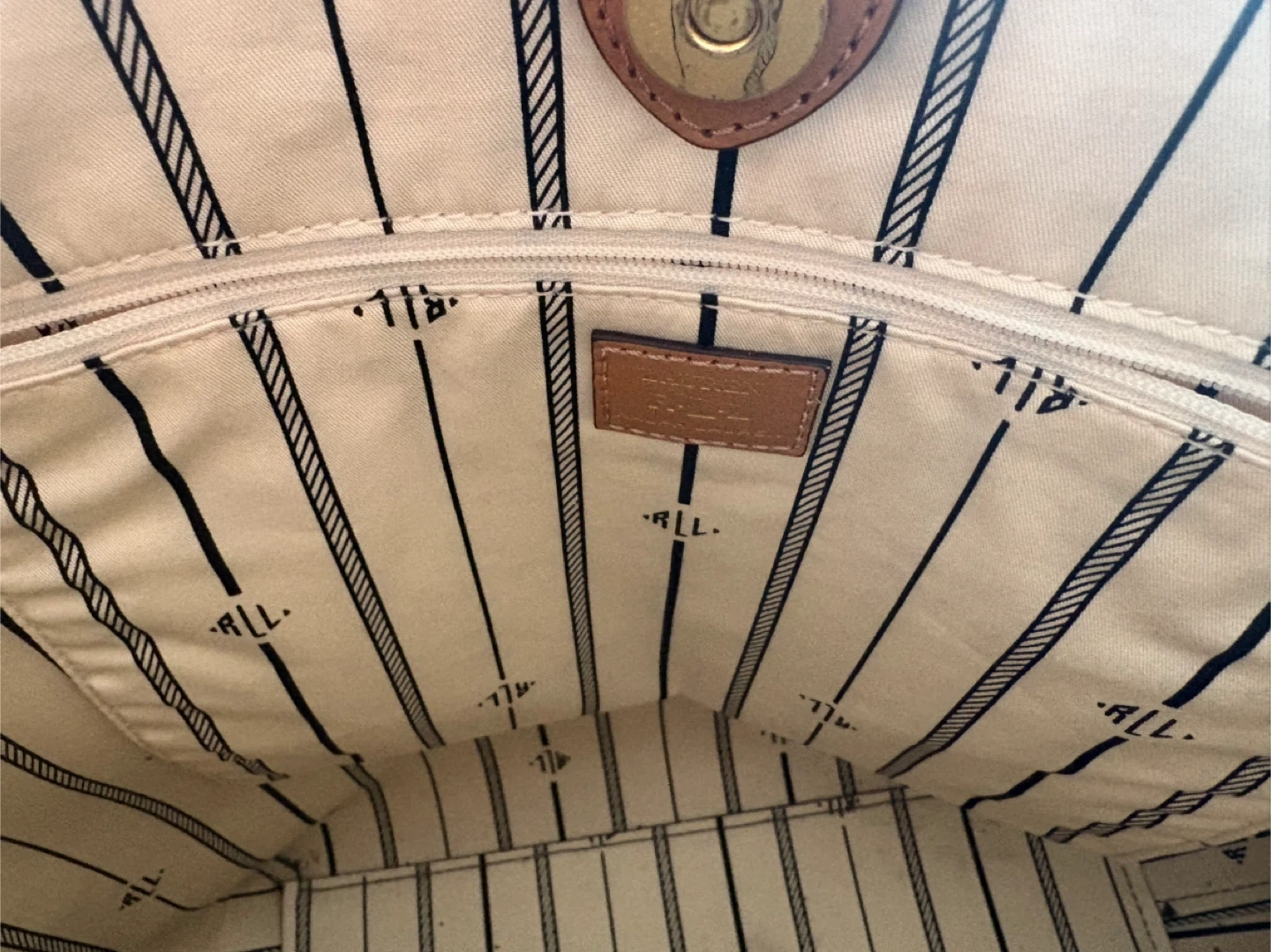 Tote bag with all-over monogram print. Interior is lined with striped fabric and features a zippered compartment. Leather trim and straps. Size is 17x13 excellent condition