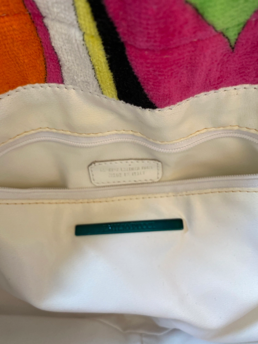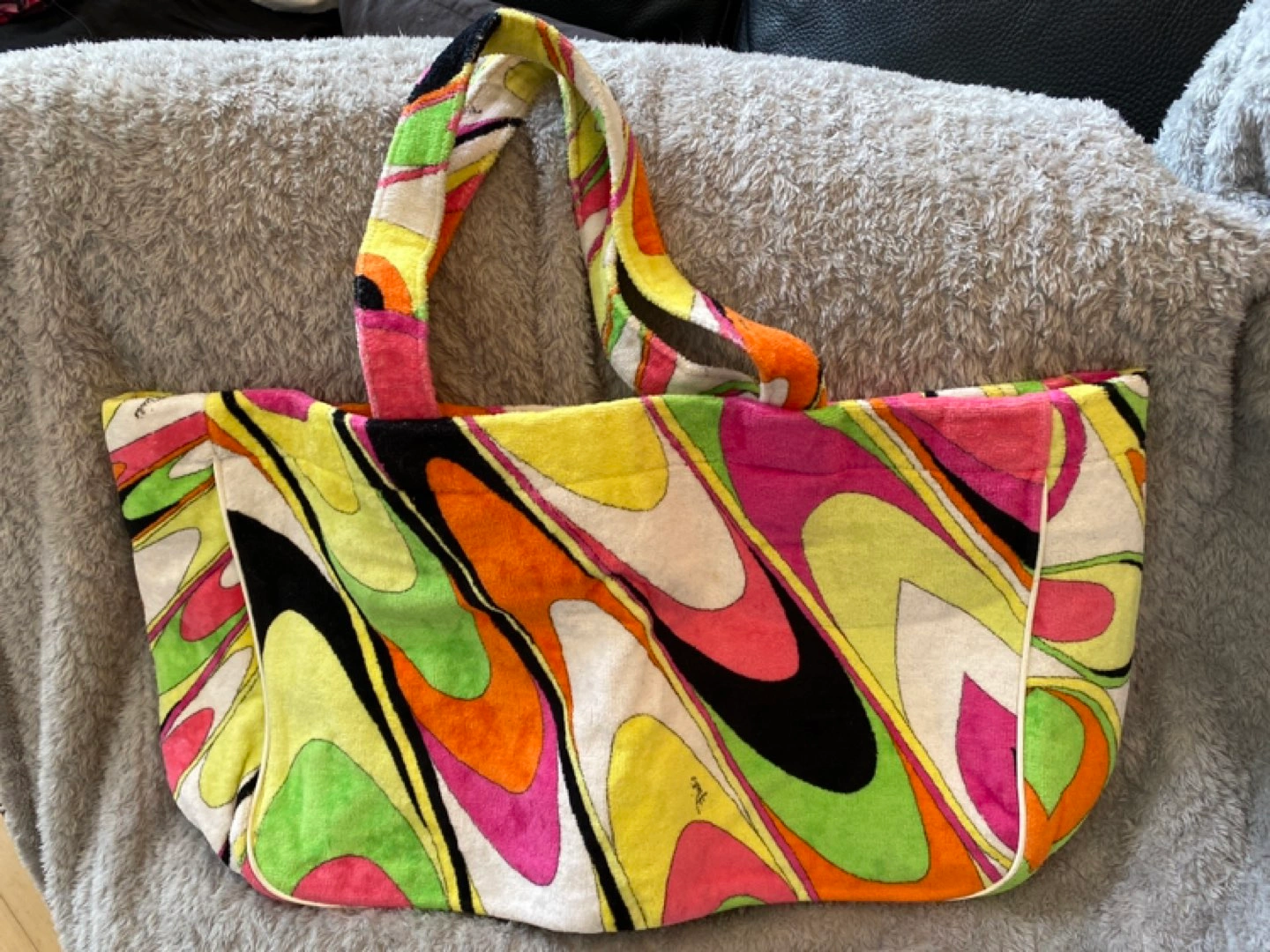 This was purchased from Holt Renfrew years ago. It’s lined with leather and the colourful outside is terry cloth. It’s large and can fit a lot of stuff. Could be great for an overnight bag as well.