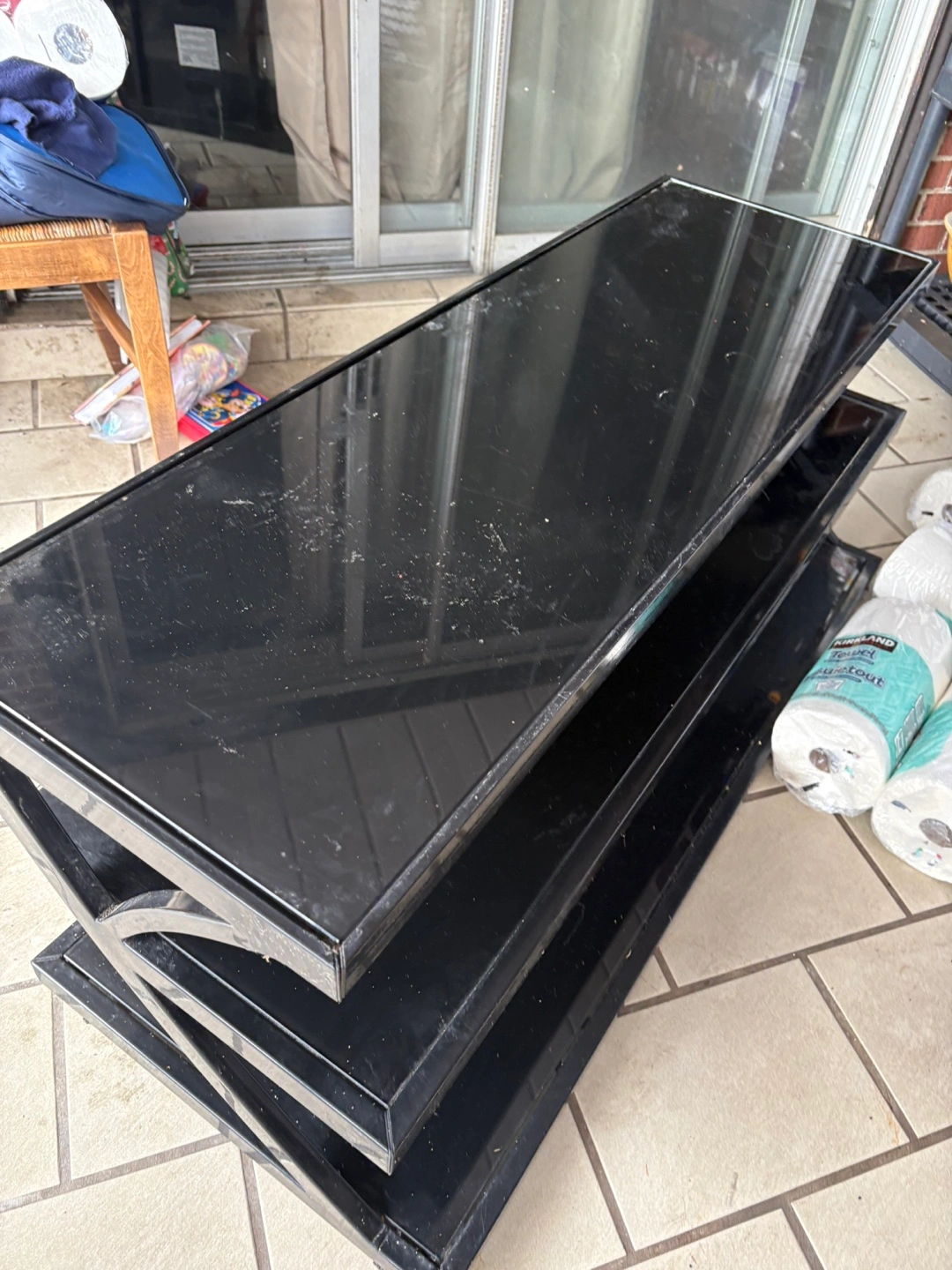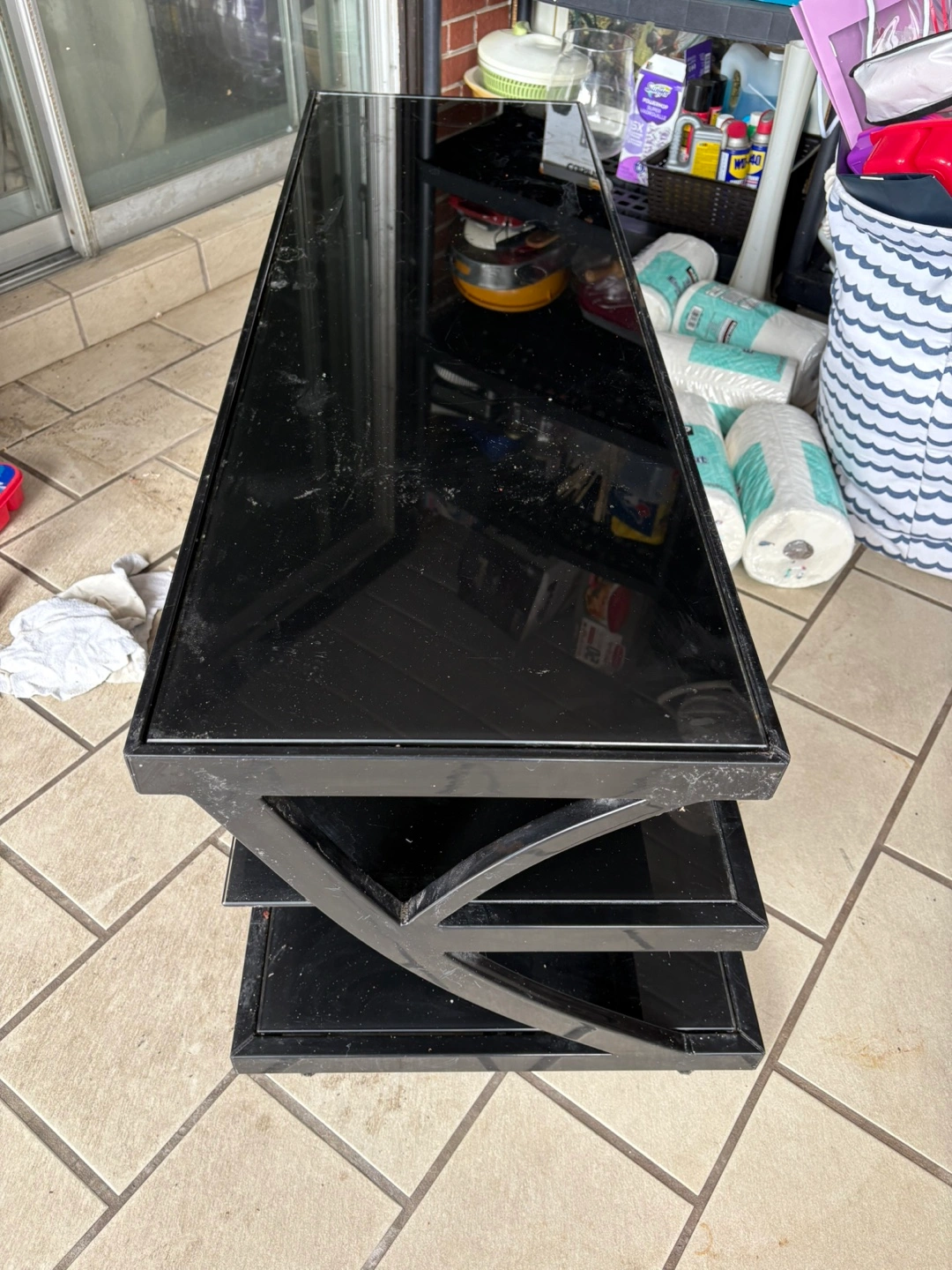 Selling a black glass shelf. It has a modern design with multiple tiers, perfect for displaying items or adding storage space. It shows some signs of use, but is still in good condition and very functional. This shelf could be a great addition to any room!