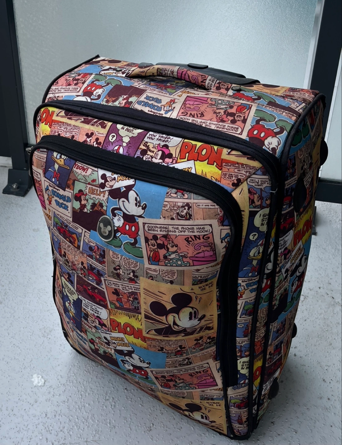 Super cute luggage featuring a Mickey Mouse comic print! It's in great shape and ready for your next adventure. The design includes lots of classic comic strip elements with Mickey and Donald Duck. Perfect for Disney fans! It’s a little dirty but you can clean it!!