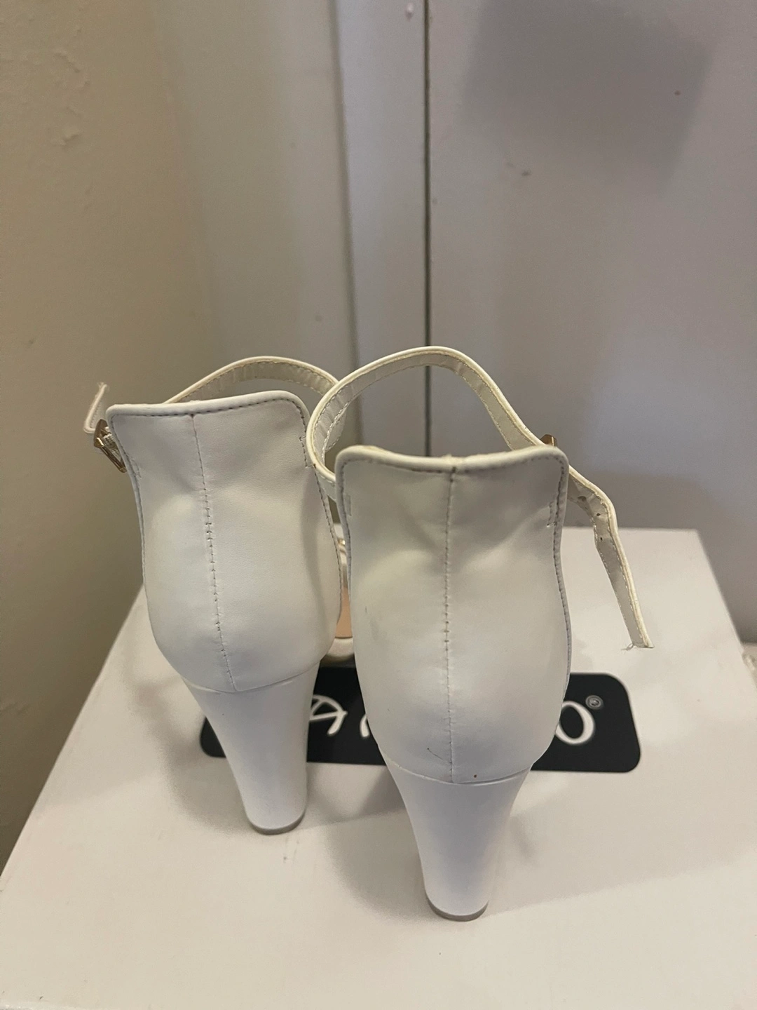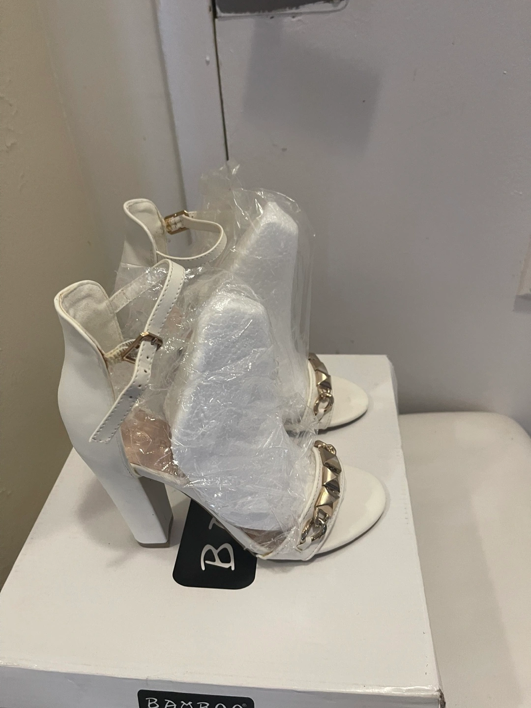 Here are some cute white Bamboo heels! They're in great condition and ready for a new home. The size is 6.1/2