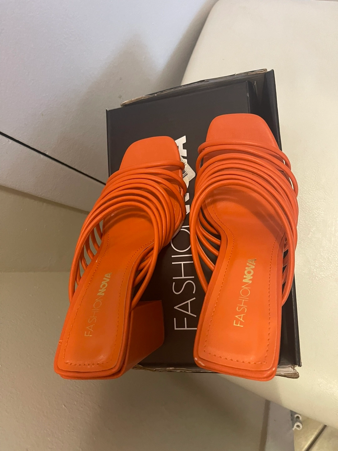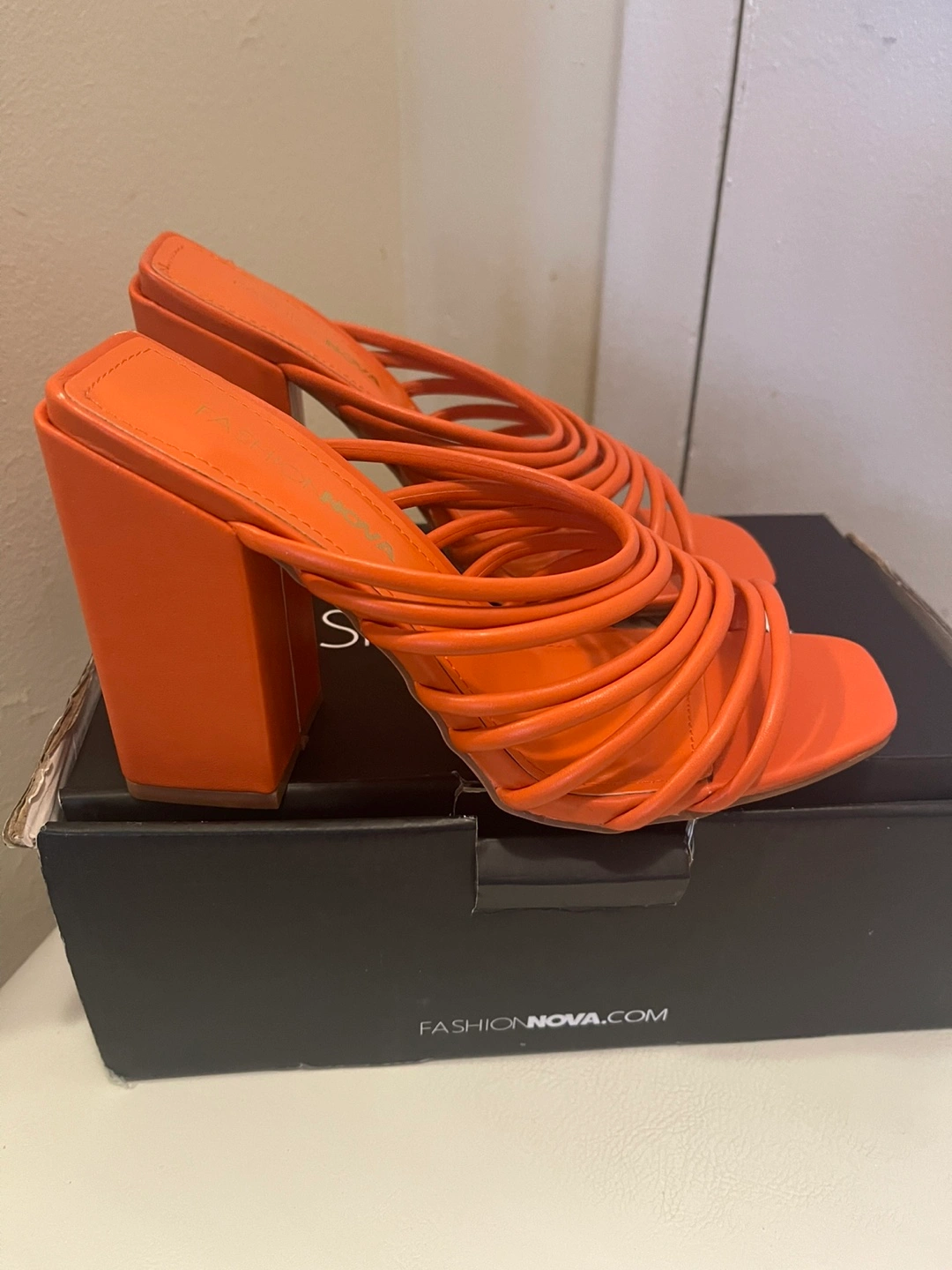 These orange heels from Fashion Nova are in great condition and ready for a new home! They come in their original box and are a size 6.1/2 These heels feature a strappy design and a block heel, perfect for dressing up any outfit