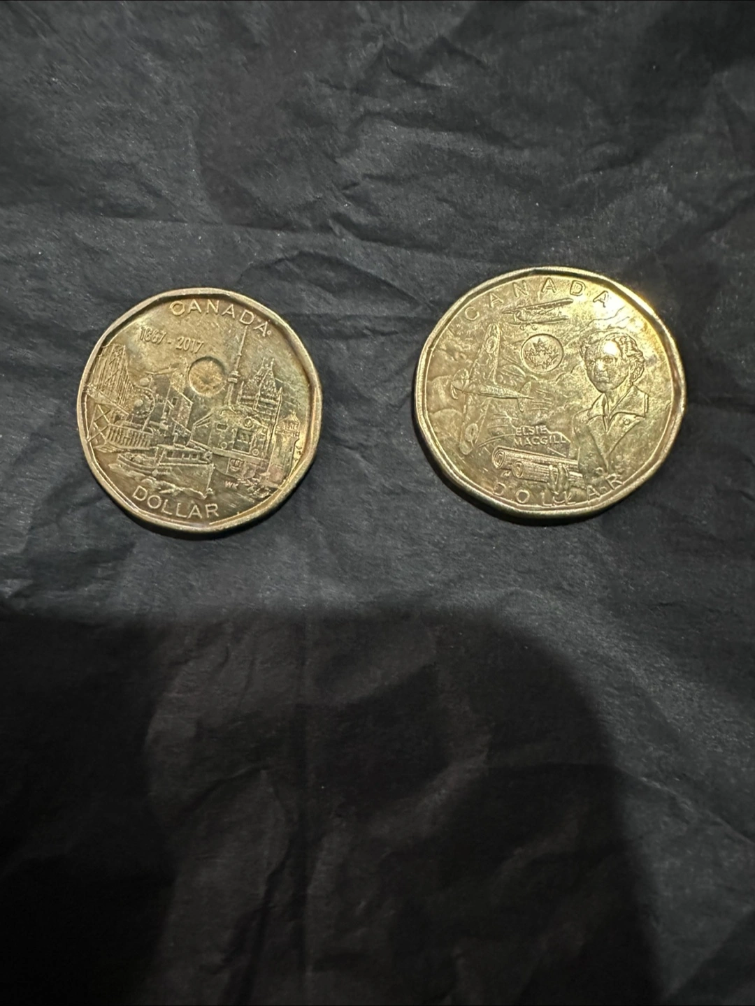 Selling a couple of Canadian dollar coins. One is from 2017 and the other is from 2022. They are in used condition. One coin celebrates Canada’s 150 anniversary showing landmarks from across Canada, second coin celebrates Elsie MacGill who excelled in aeronautical engineering. Coins need cleaning. Smoke free home.