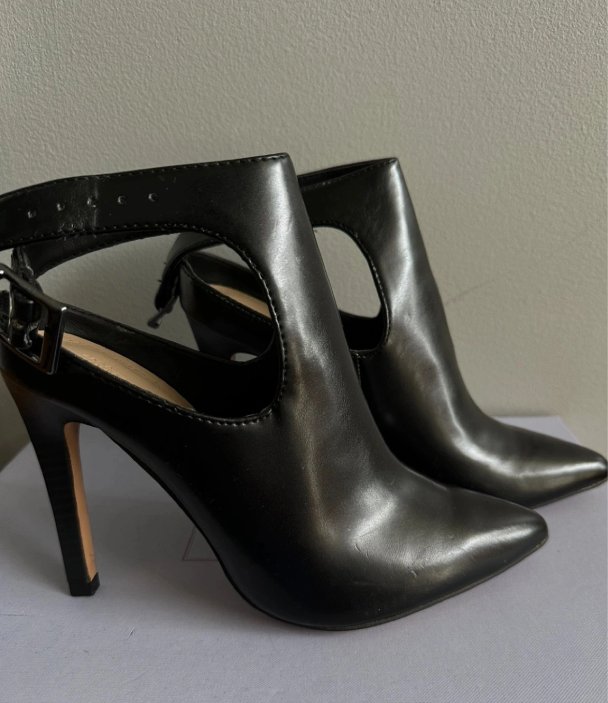 ✨Great for fall! Black leather ankle booties with a pointed toe and high heel. Features an ankle strap with a buckle closure and a cut-out detail on the side.
