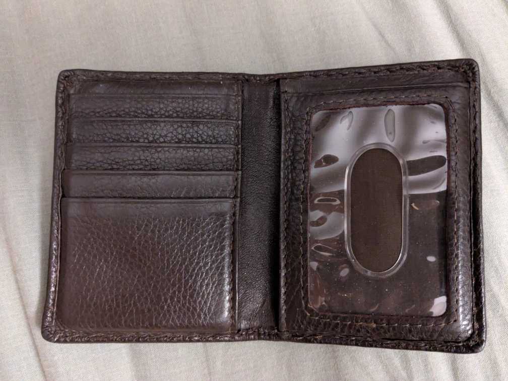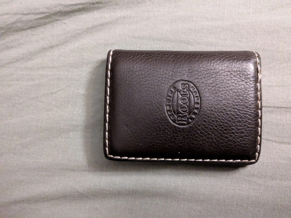 Selling a gently used Roots leather wallet. It's a classic brown colour with nice stitching detail. Has slots for cards and a clear ID window. Perfect for everyday use!