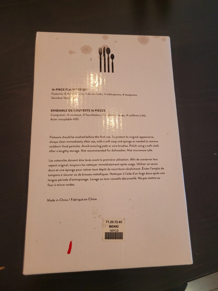 335Selling a BENXI 16-piece flatware set. It includes 4 dinner knives, 4 dinner forks, 4 tablespoons, and 4 teaspoons. The set is made of stainless steel and comes in its original box Spadina and Fort York