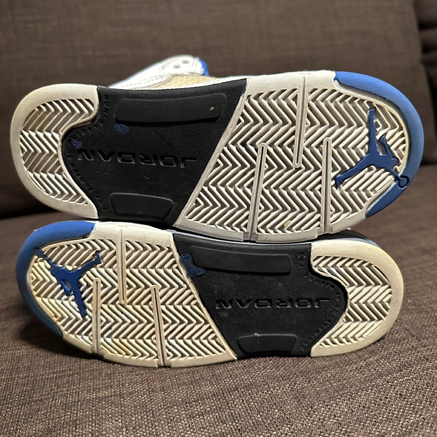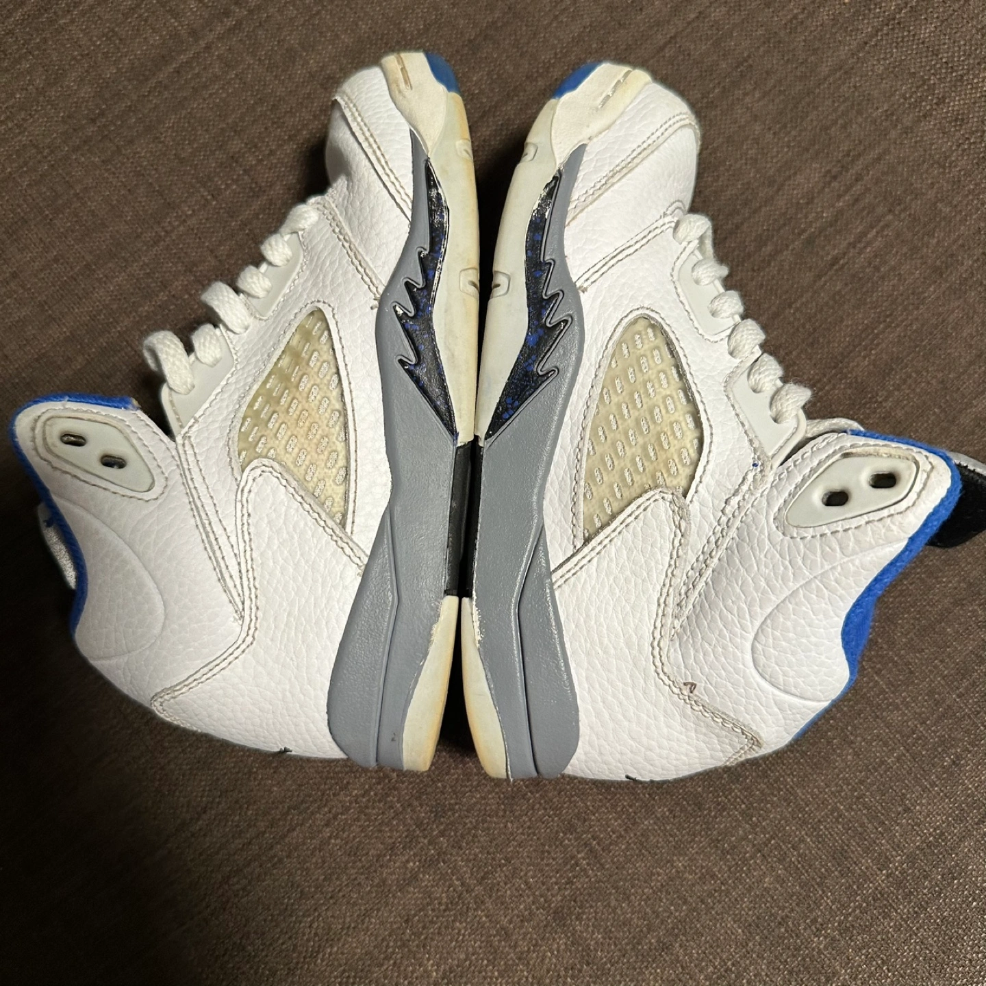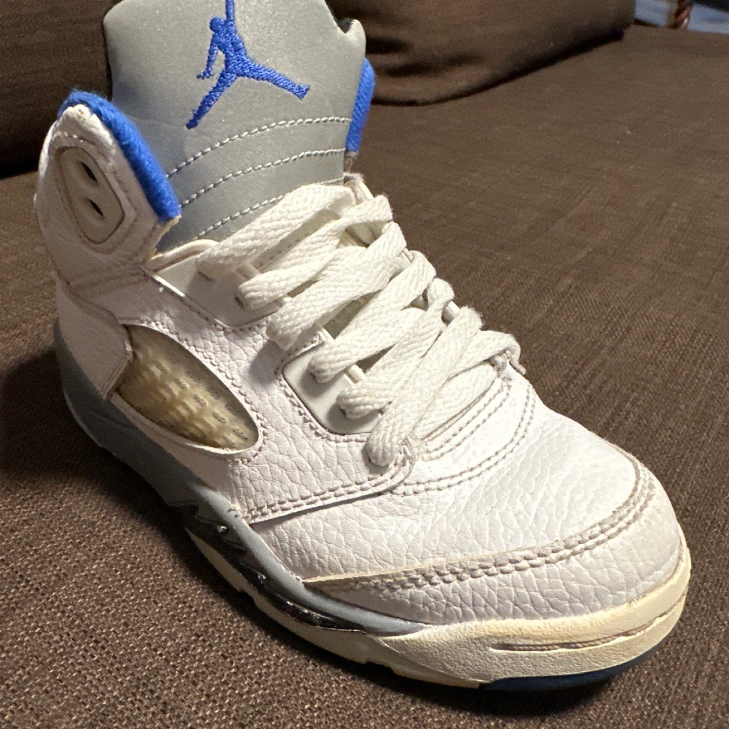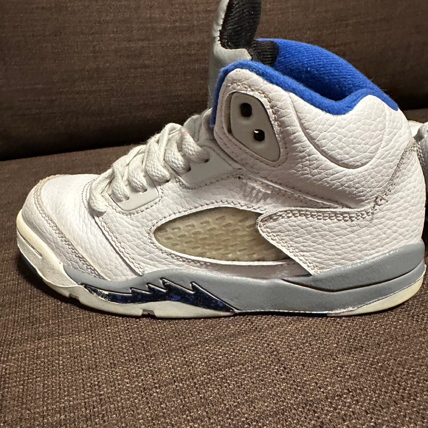 These are a pair of Jordan 5 Retro in white and stealth colourway. These are a youth size 12 С ( probably for kids 4-5 years old) They are in very good condition, with some signs of wear.