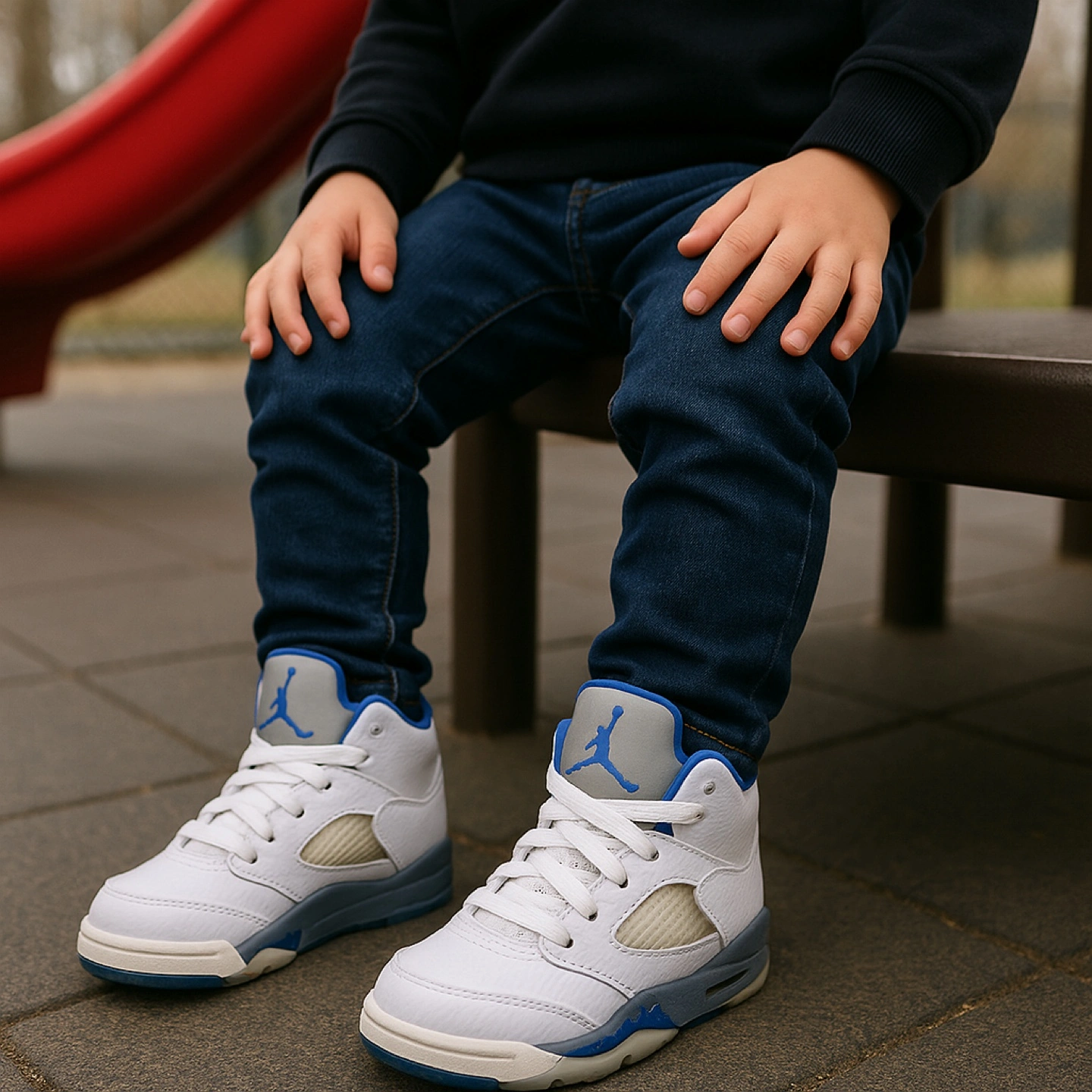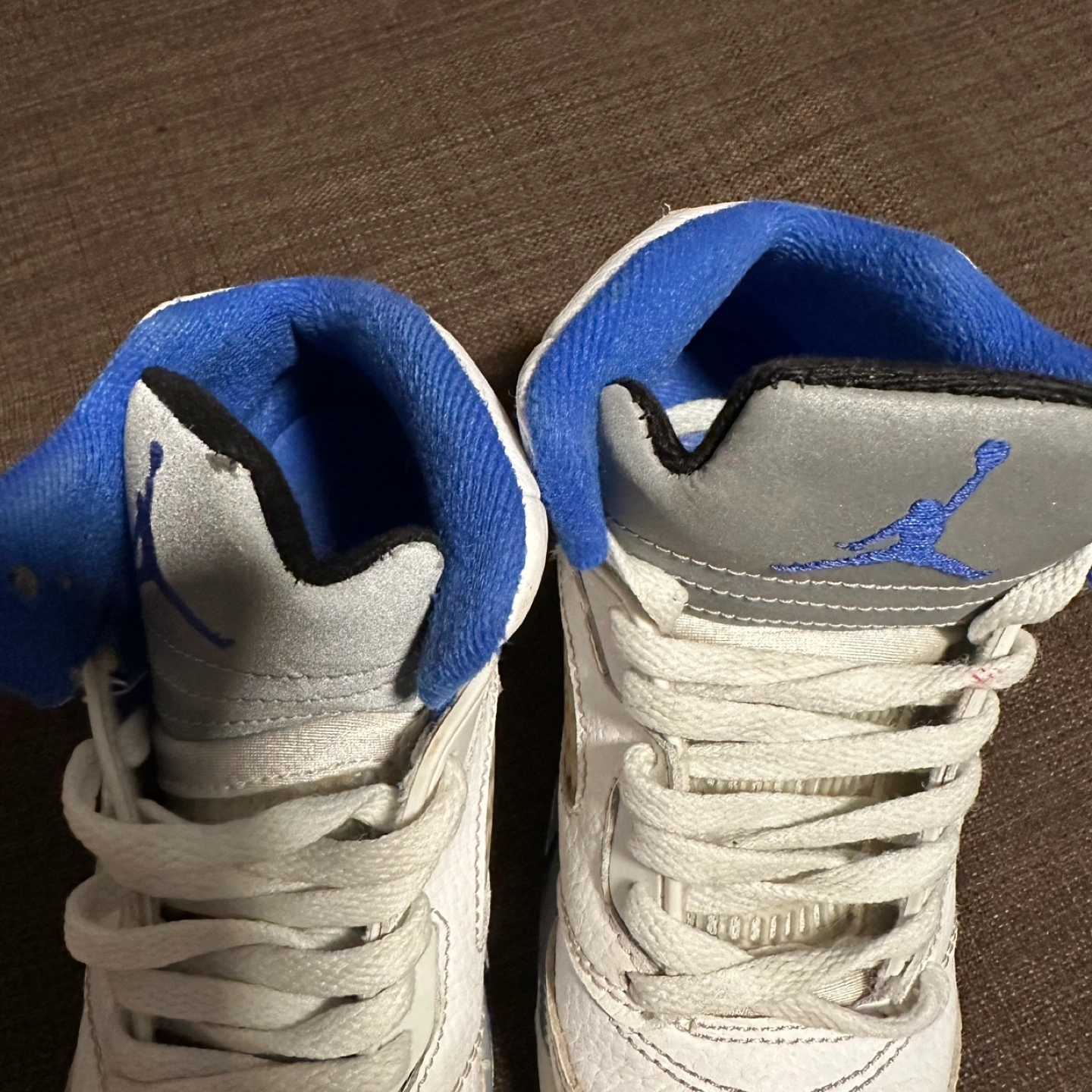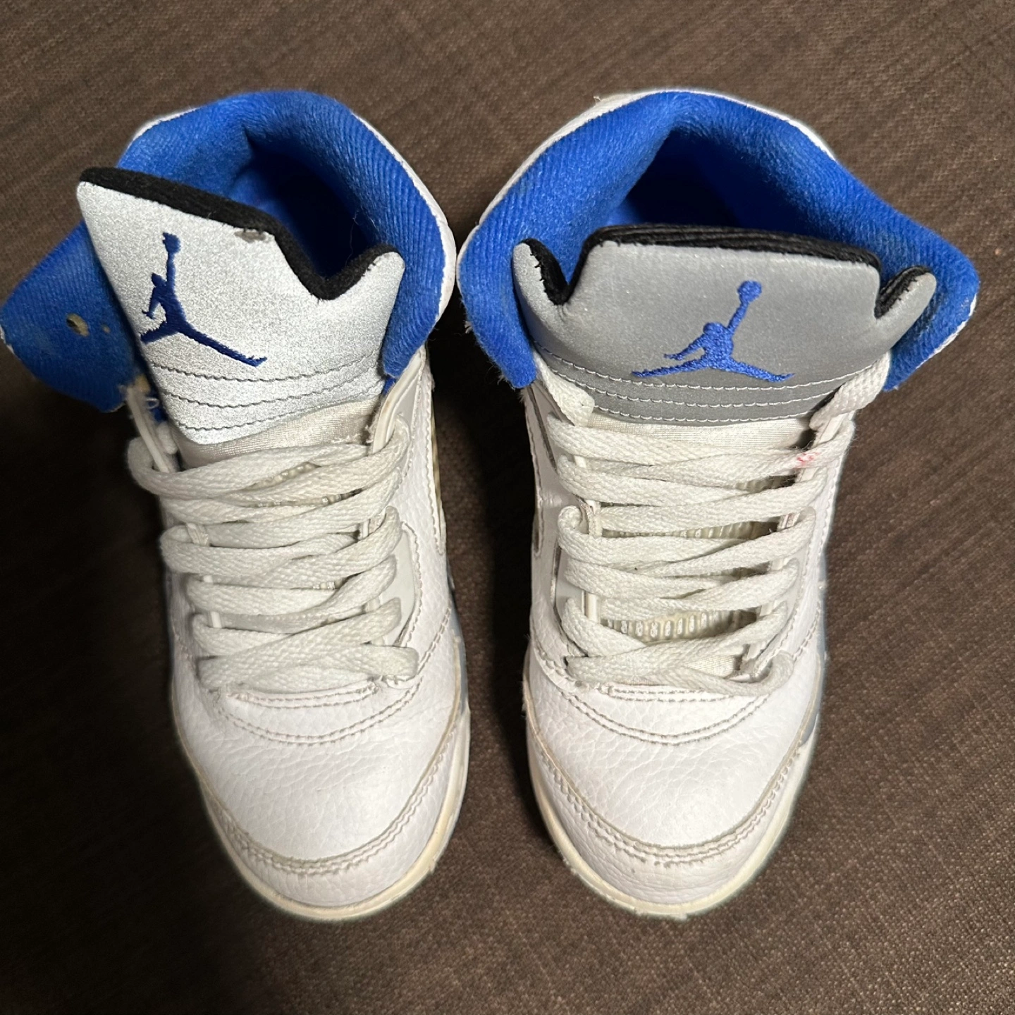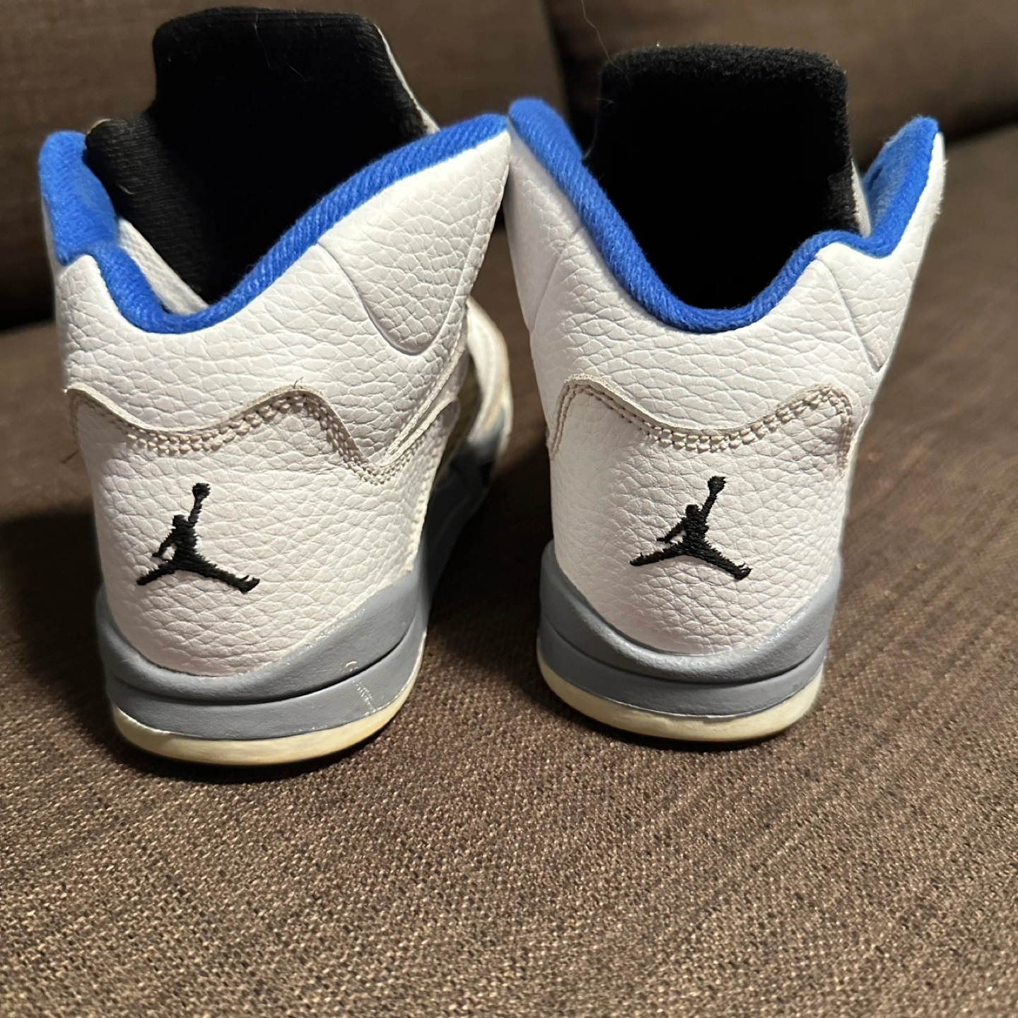 These are a pair of Jordan 5 Retro in white and stealth colourway. These are a youth size 12 С ( probably for kids 4-5 years old) They are in very good condition, with some signs of wear.