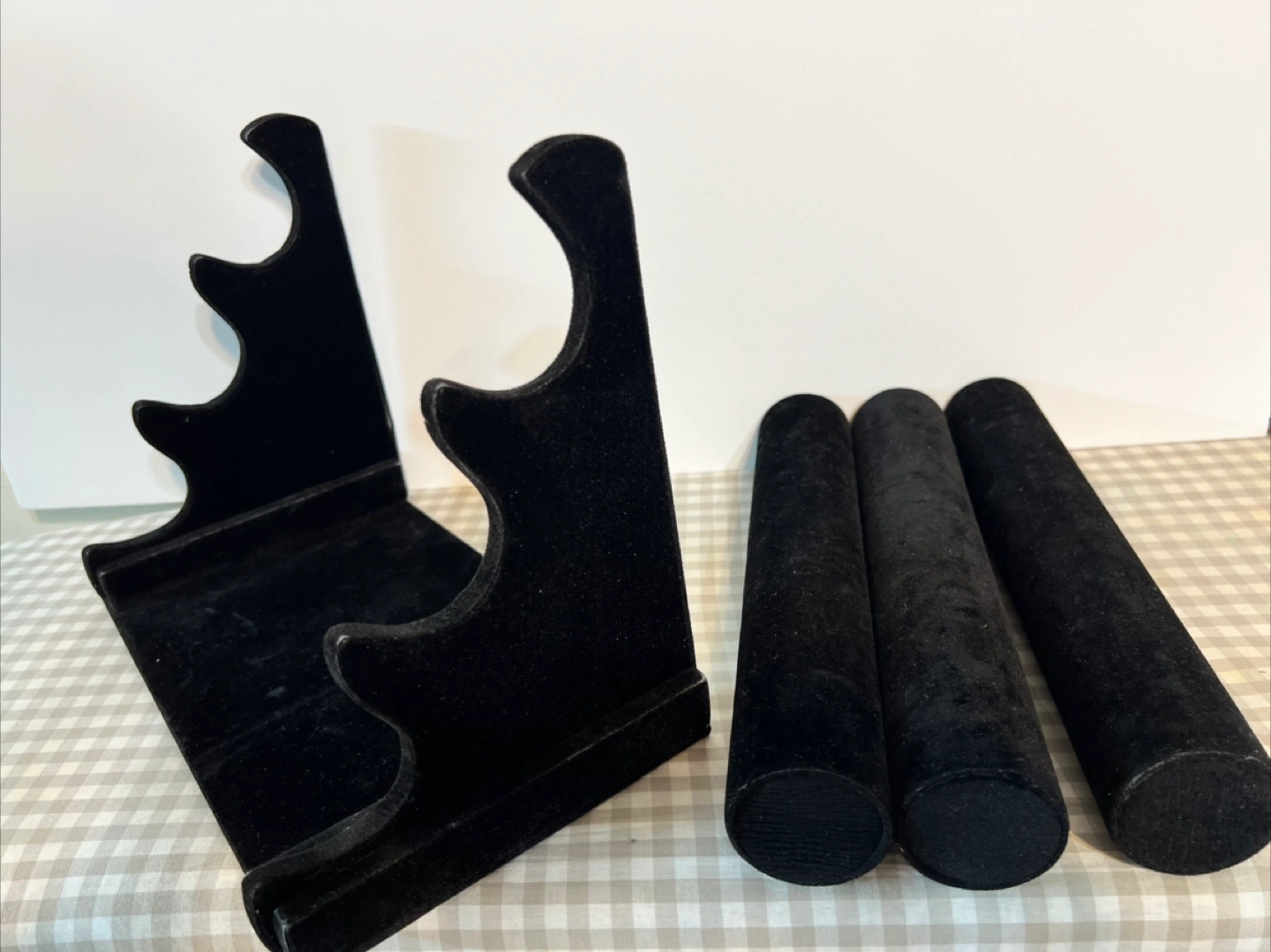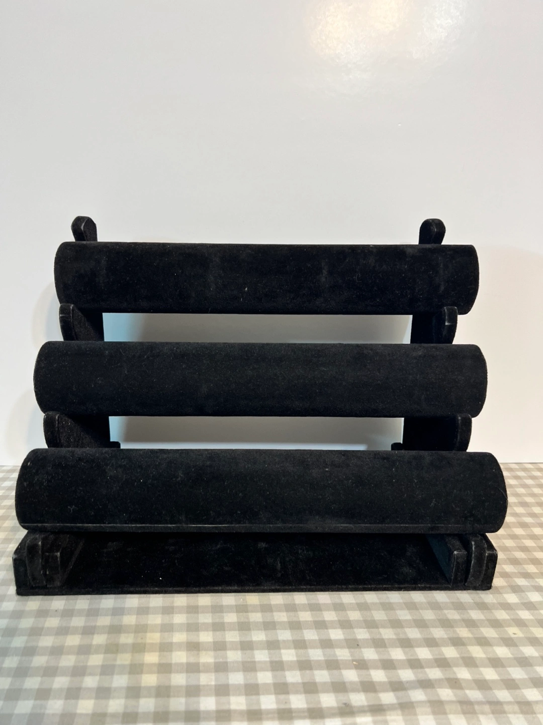 Here's a black velvet 3-tier jewelry display stand. It's perfect for organizing and displaying your bracelets, necklaces, and other accessories. It is in good condition and ready for a new home!