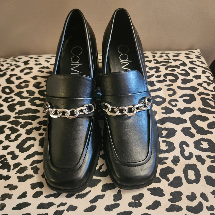 Stylish Calvin Klein loafers! They are black leather with a chunky heel and silver chain detail. They are in gently used condition , only worn for a few hours n were too tight .