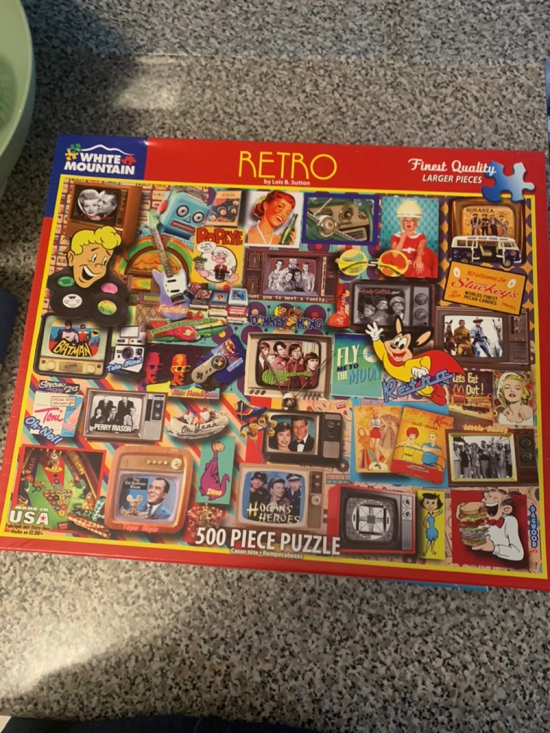 Selling a White Mountain 'Retro' 500-piece puzzle! It features a collage of classic TV shows and retro images. A fun activity for puzzle lovers!
