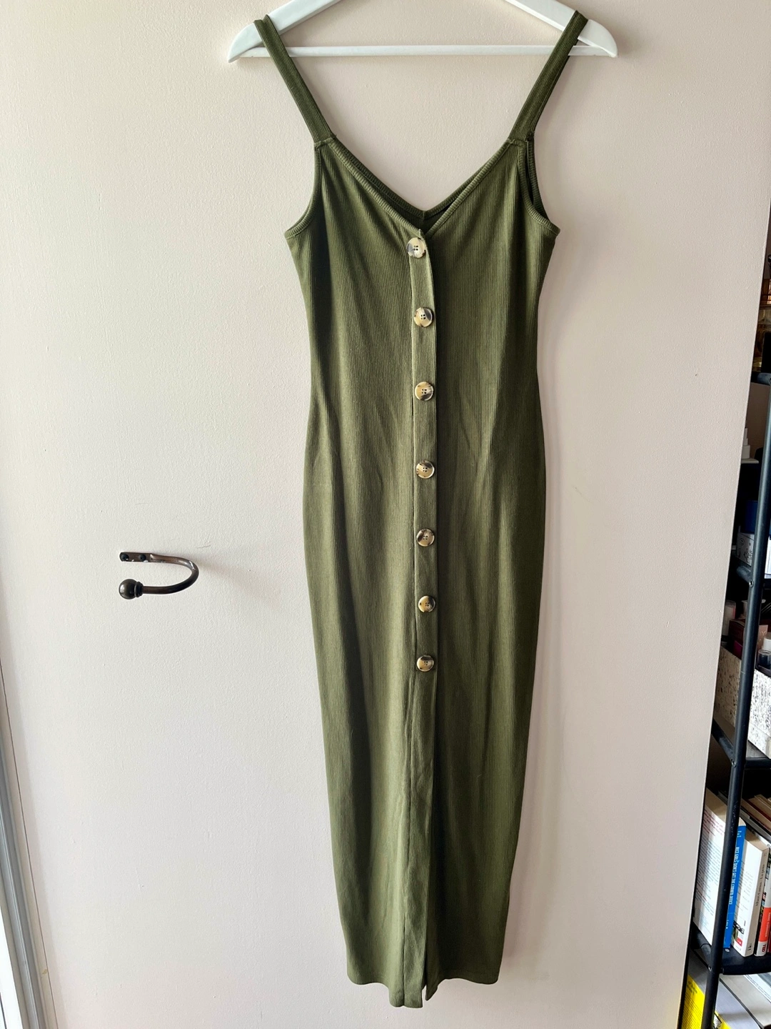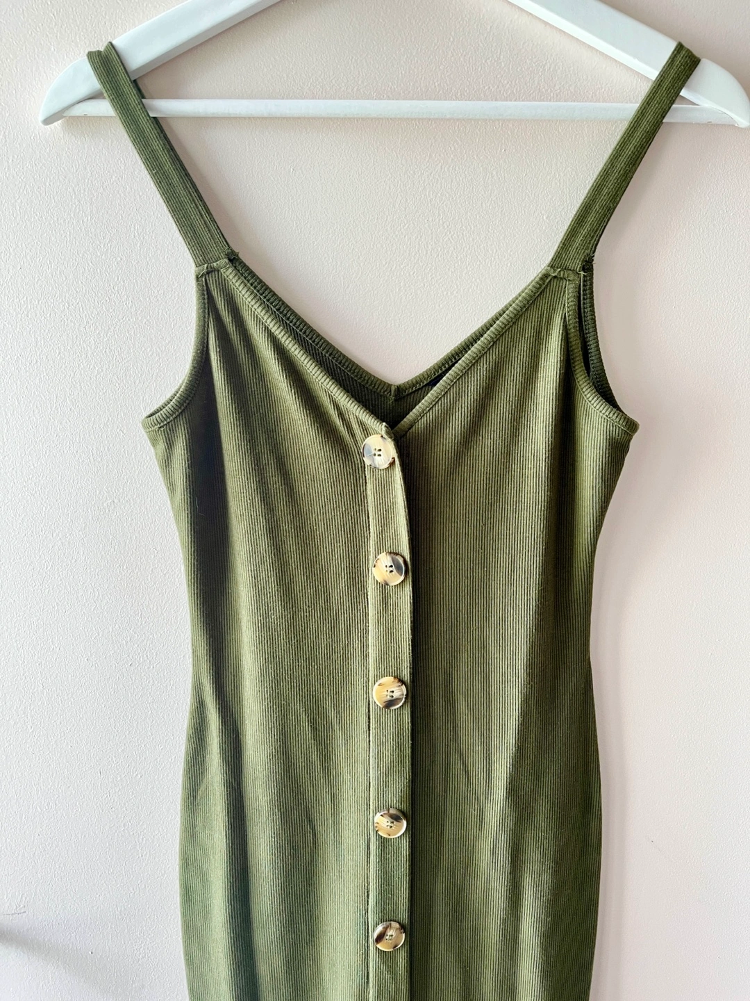 Long Olive Green Button-Down Ribbed Bodycon Dress Size XS or 2