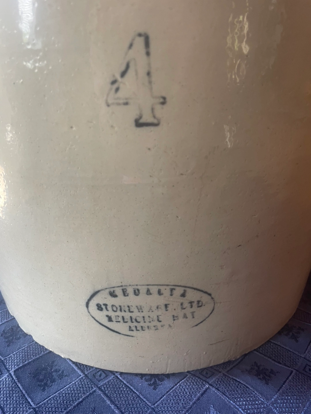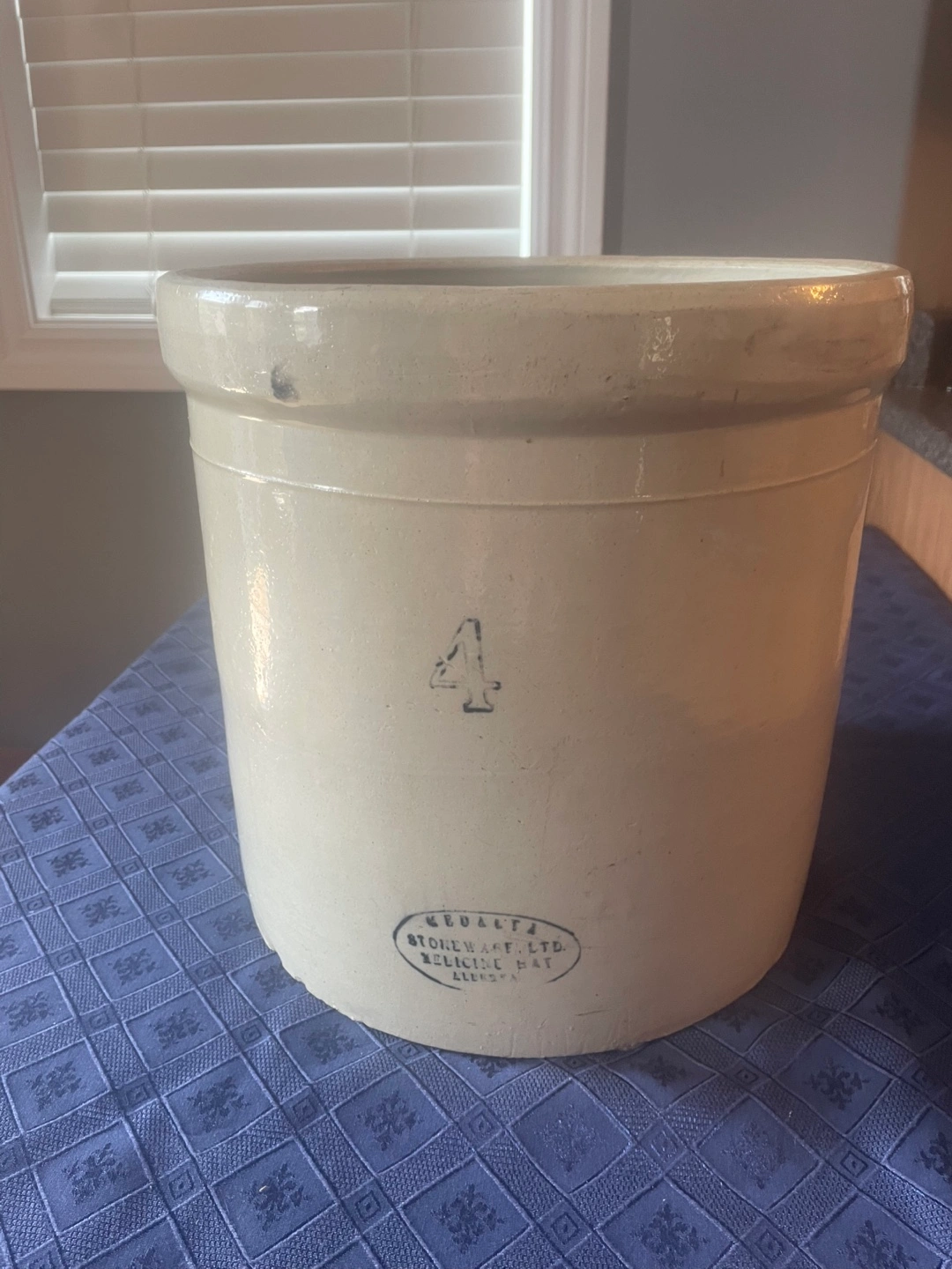 Selling a Medalta Stoneware crock, marked with a '4', indicating its 4-gallon capacity. It's a lovely piece of stoneware from Medicine Hat. Perfect for adding a touch of rustic charm to your home!