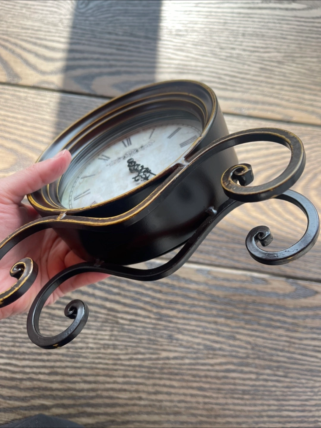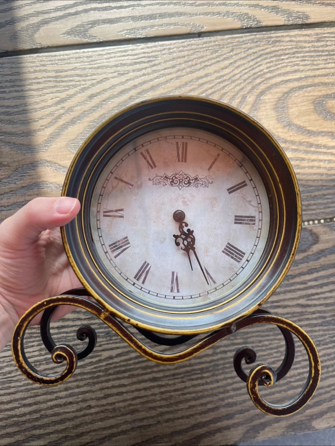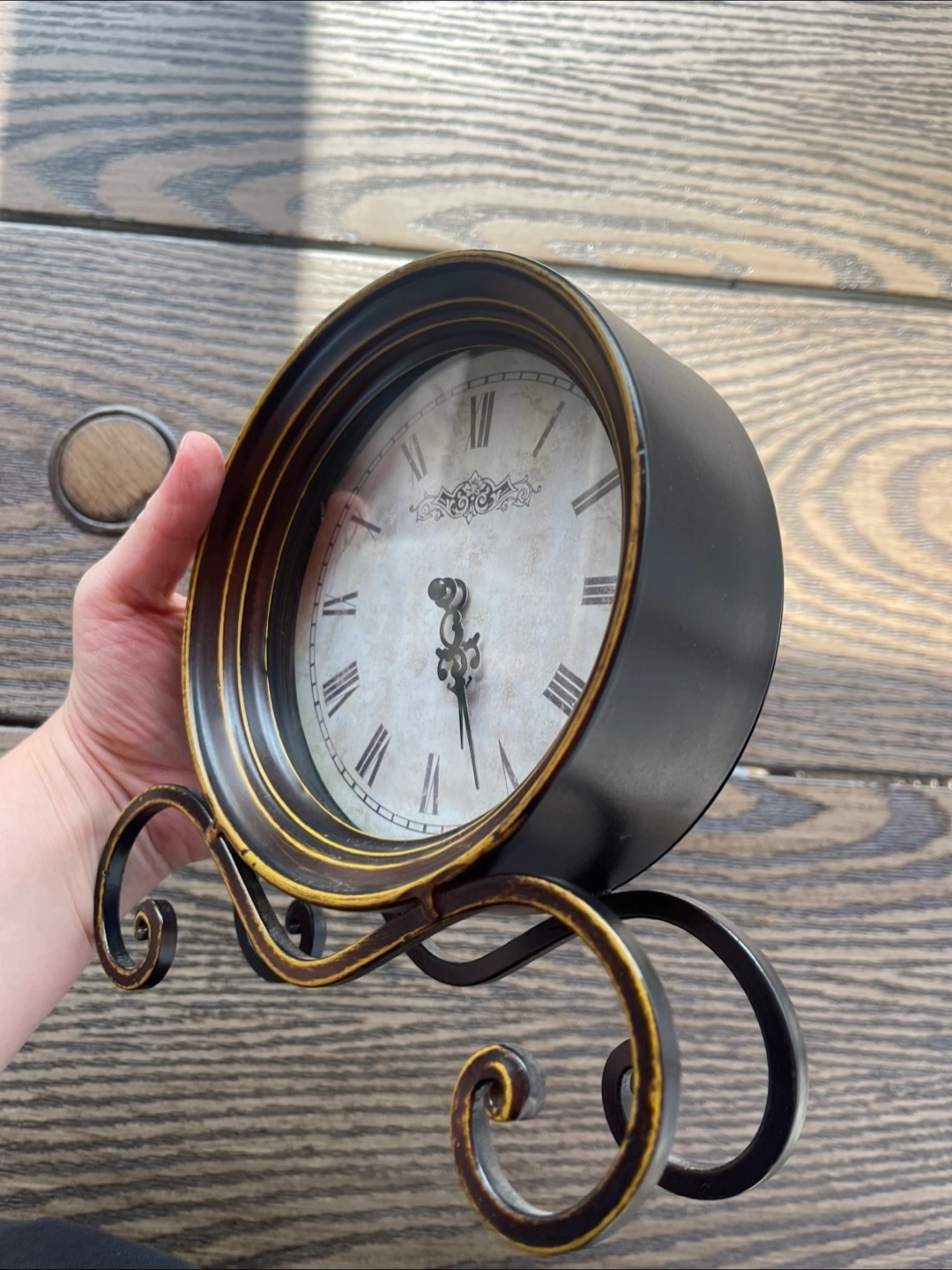 Selling a decorative table clock with Roman numerals. It has a black and gold finish and a unique stand. Perfect for adding a touch of vintage charm to your home decor!
