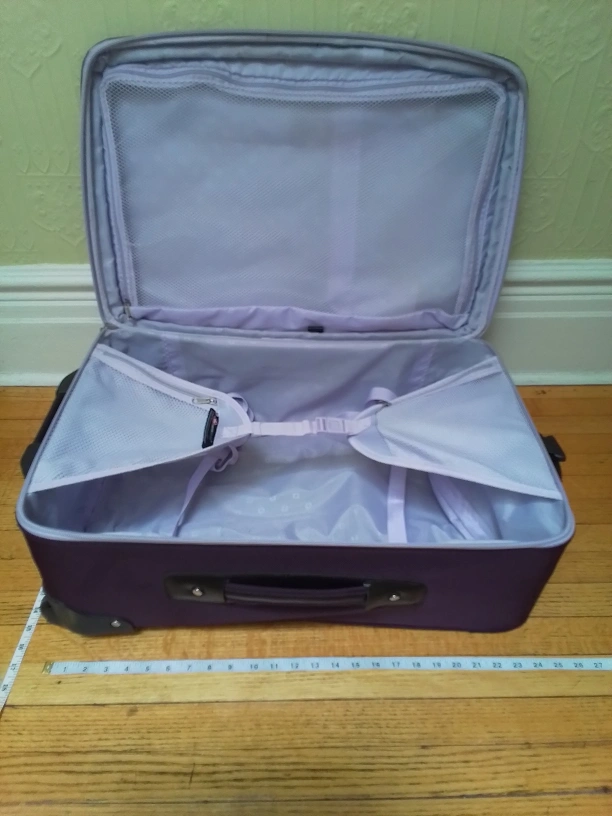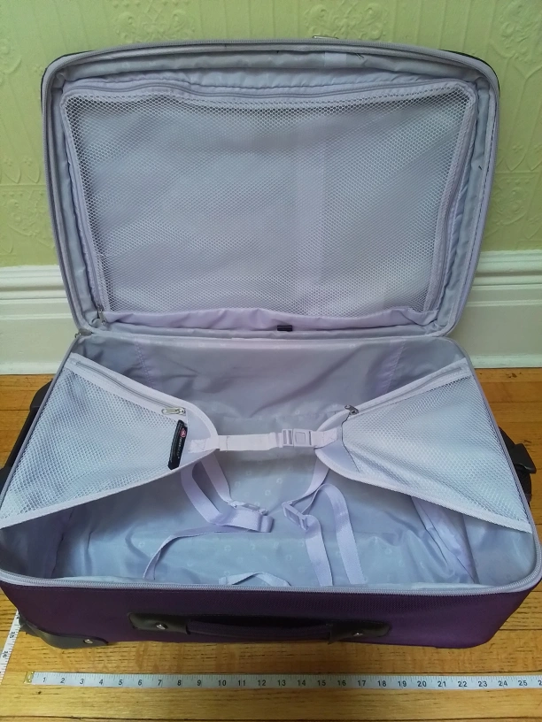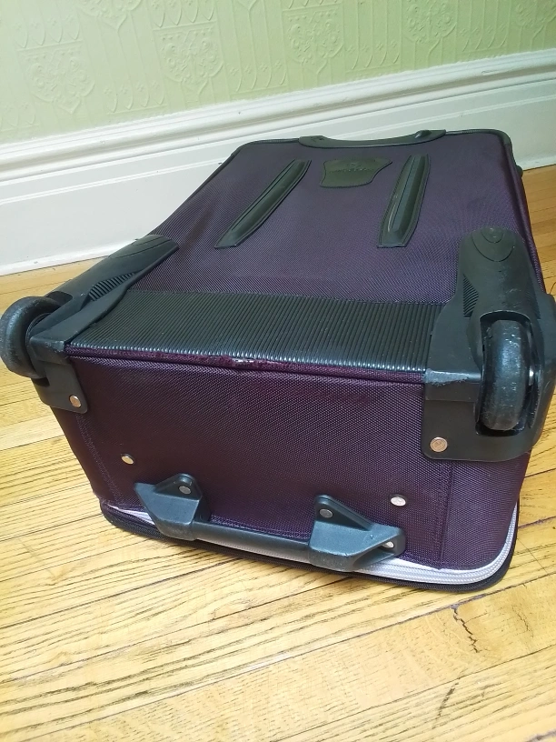 Here's a gently used Swiss Gear rolling suitcase in great shape! It's a convenient size for travelling, but not carry-on size. LxWxH = 17"x9"x26.5". The suitcase has a telescoping handle and smooth-rolling wheels, making it easy to navigate through airports. It also has a couple of exterior pockets for easy access to travel documents or other essentials and separate straps to secure personal item or purse.